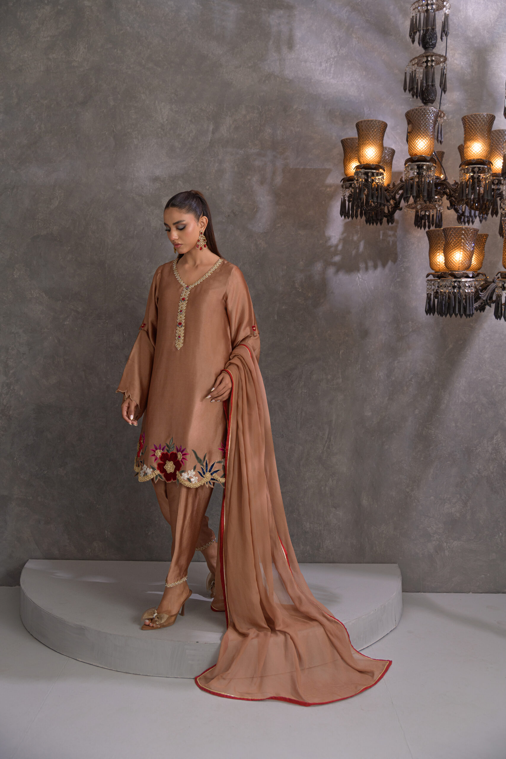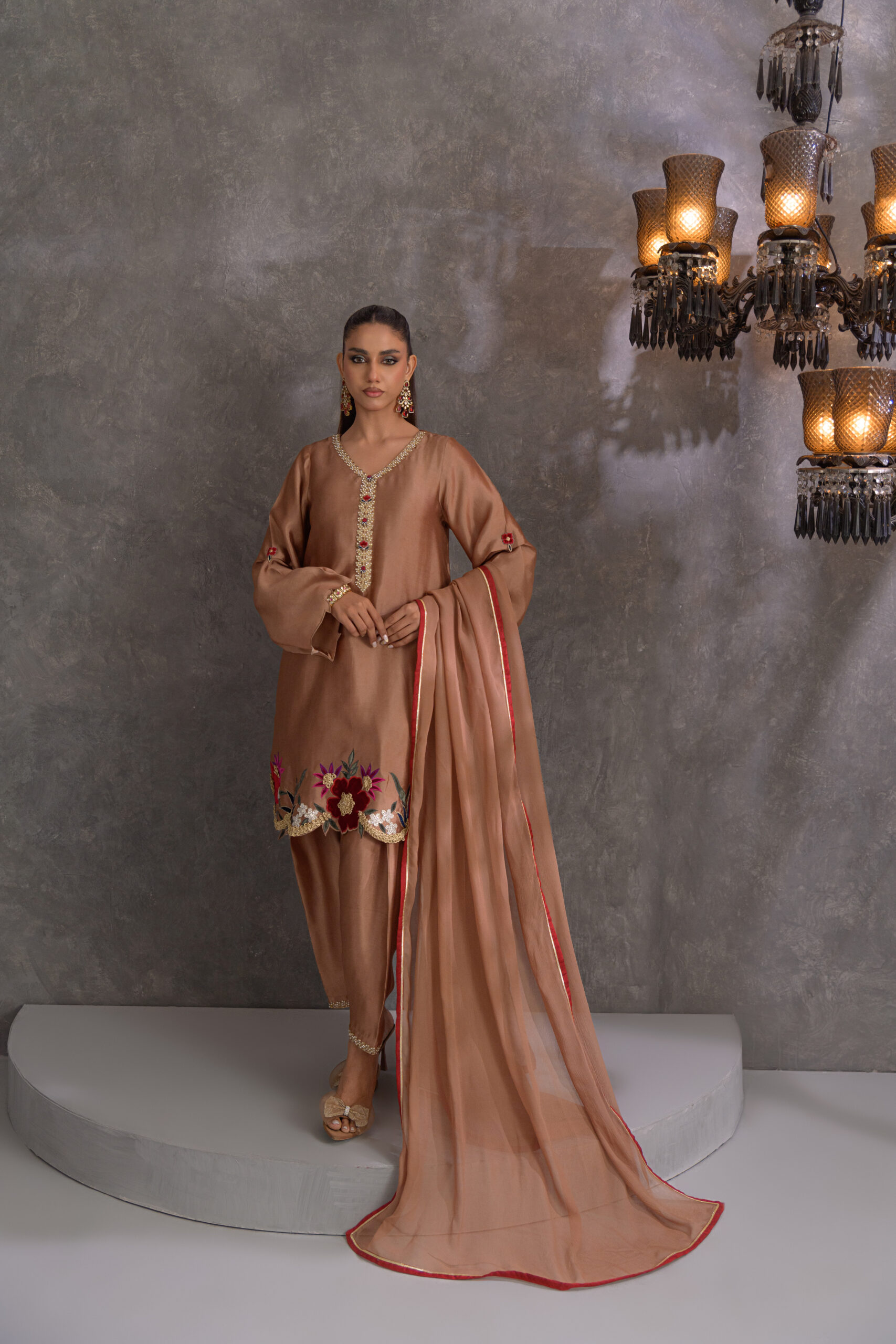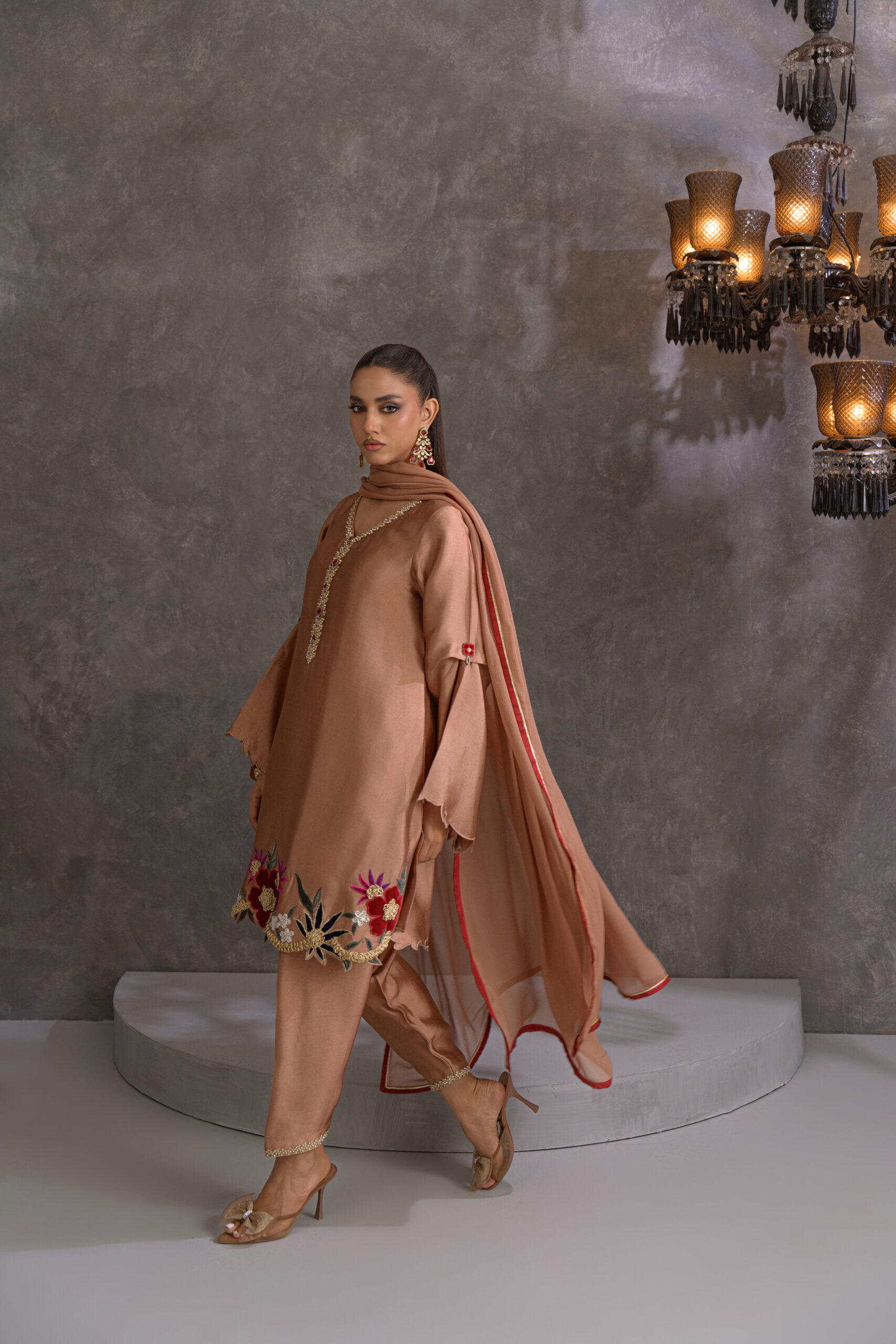Crafted in rich almond brown sheesha silk, this A-line short top enhanced with velvet appliqué and exquisite zari 3D scallop embroidery, finished with subtle stone detailing on hem. A graceful neckline completes the look, paired with a khari shalwar and flowy chiffon dupatta.
