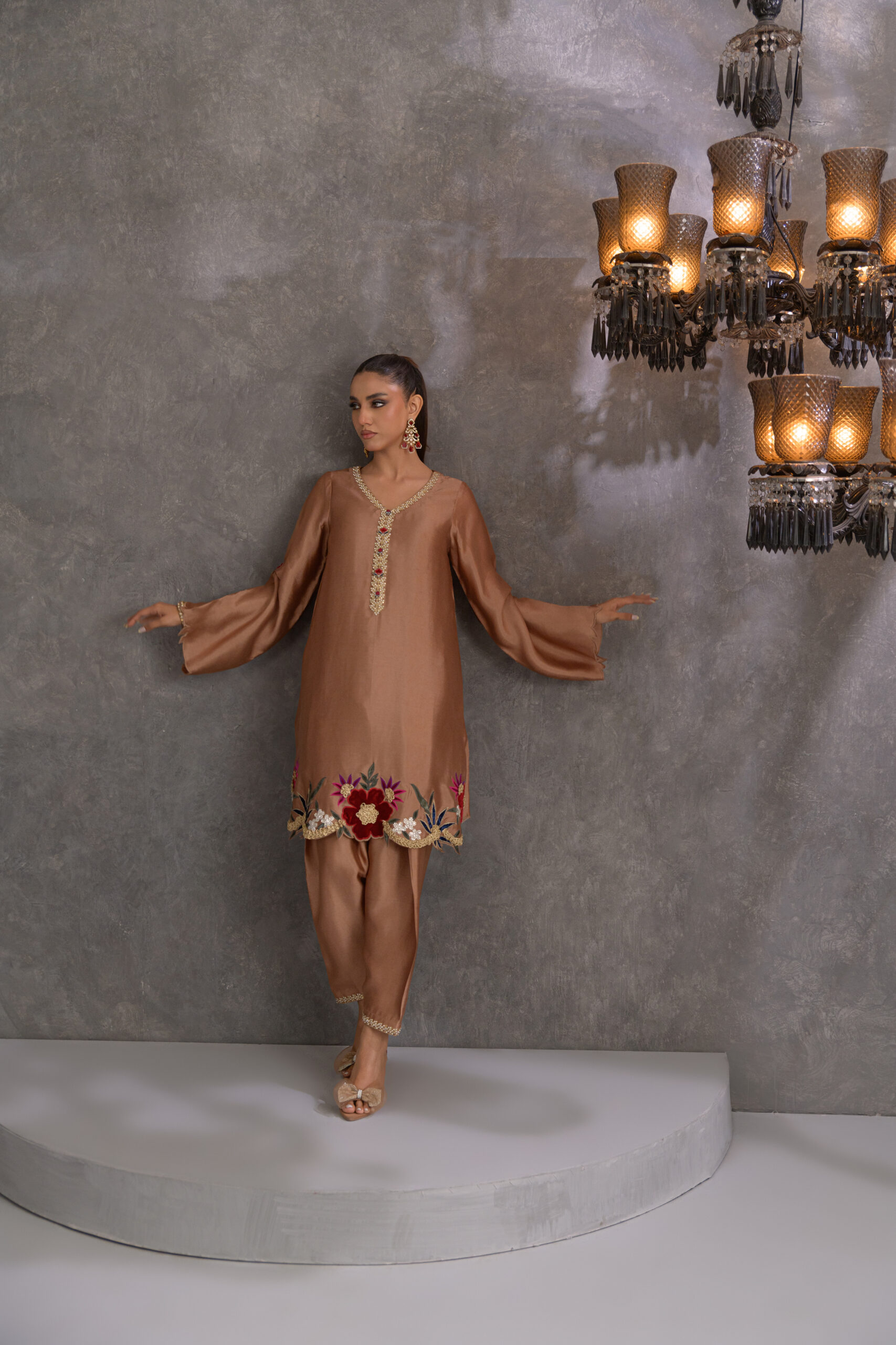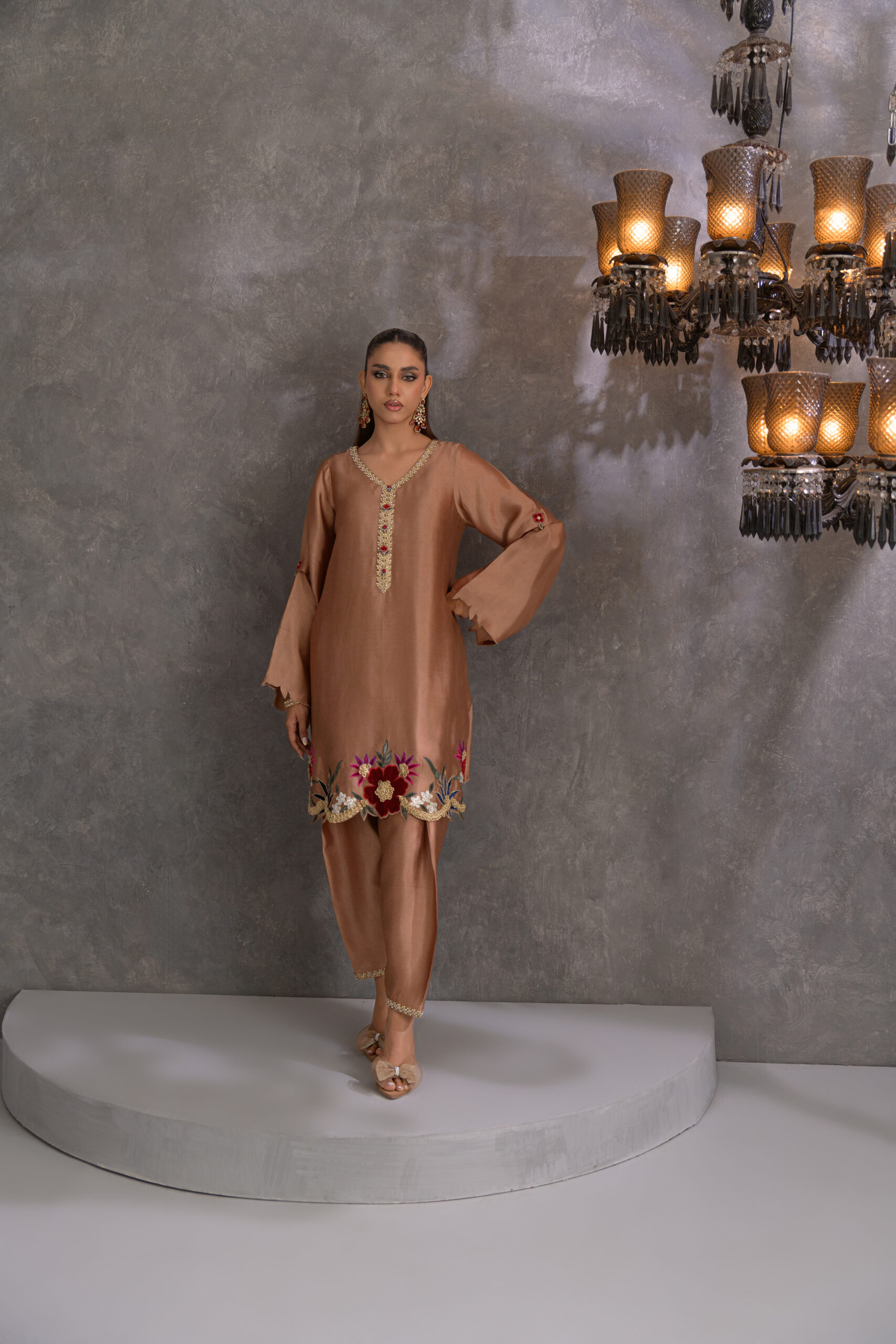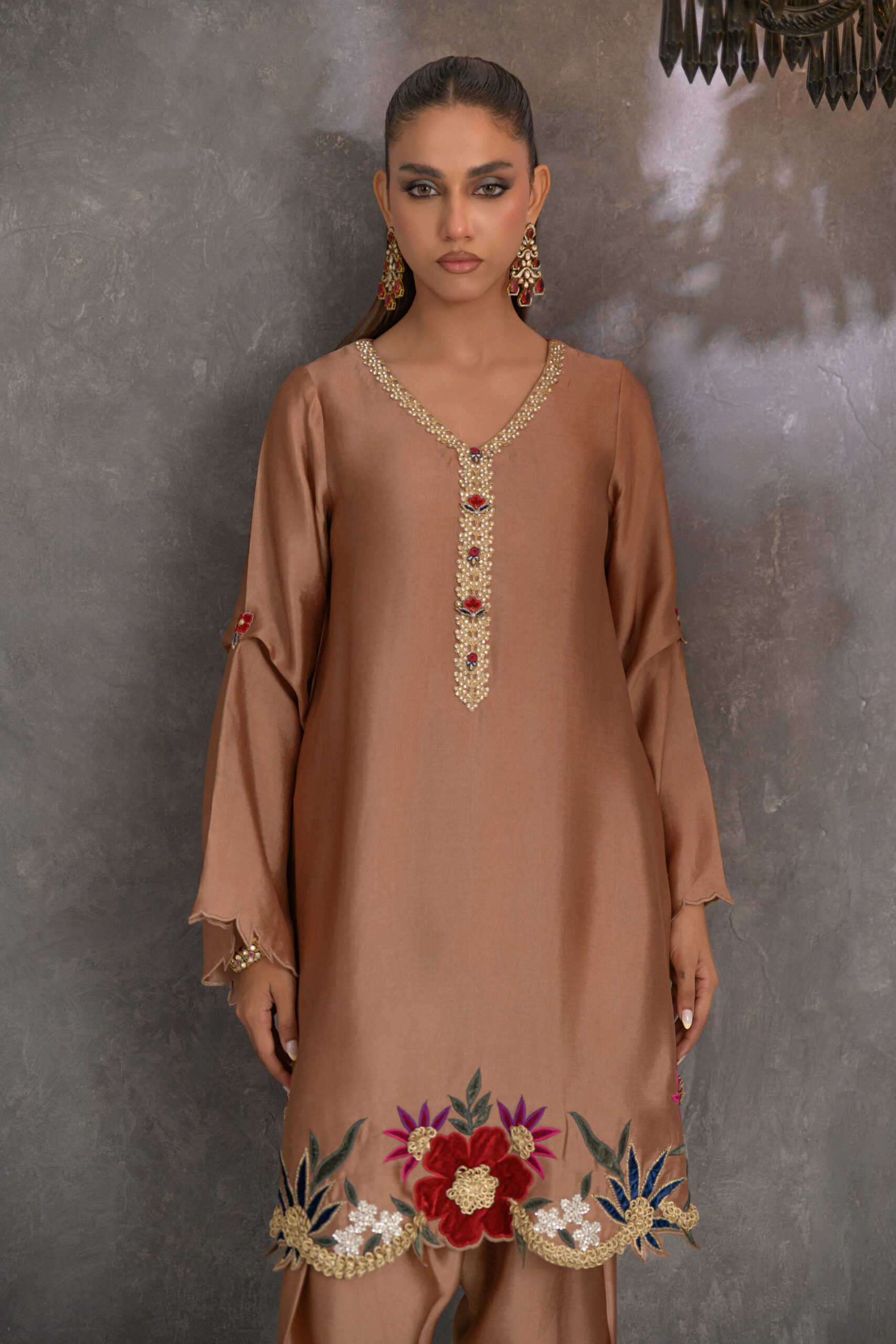 Crafted in rich almond brown sheesha silk, this A-line short top enhanced with velvet appliqué and exquisite zari 3D scallop embroidery, finished with subtle stone detailing on hem. A graceful neckline completes the look, paired with a khari shalwar and flowy chiffon dupatta.