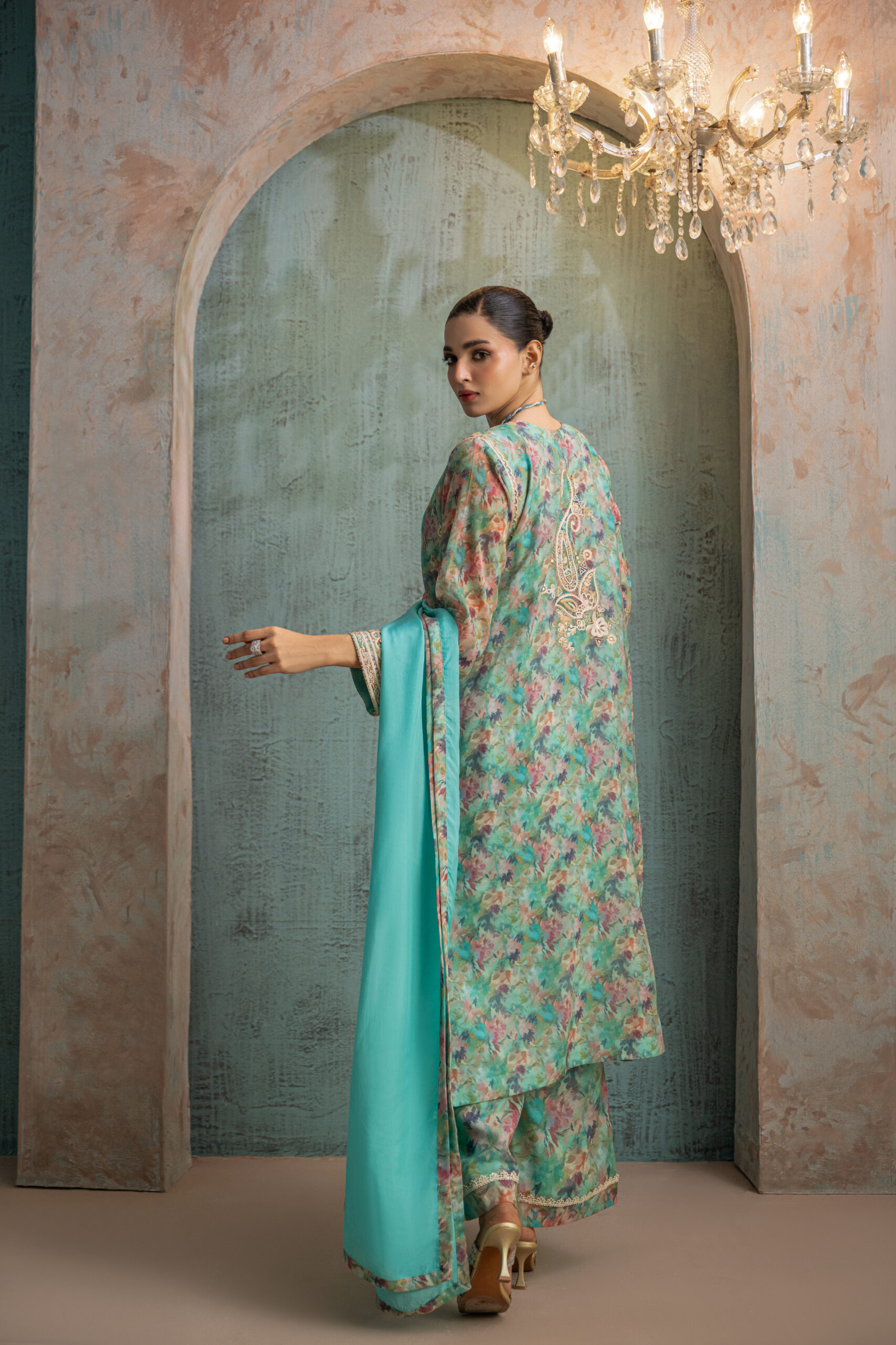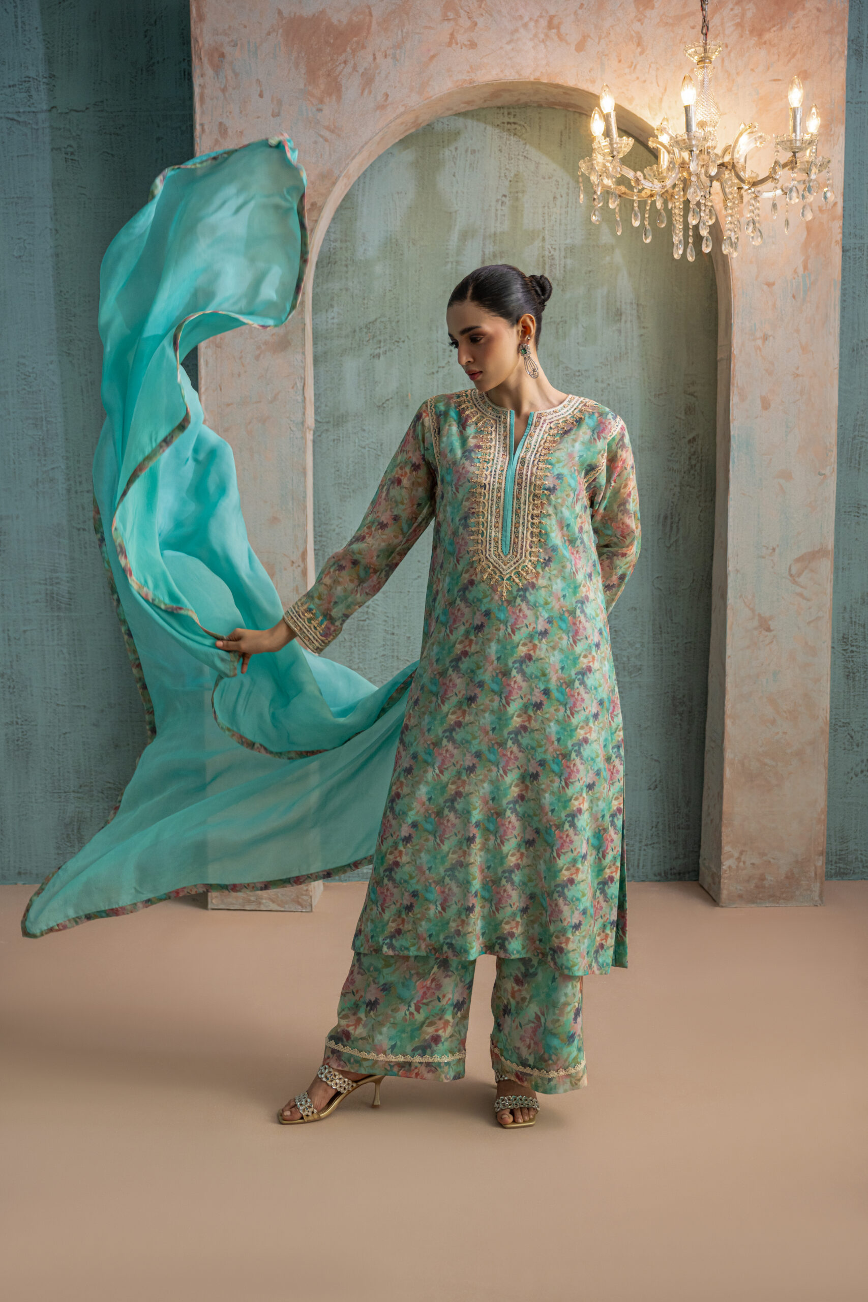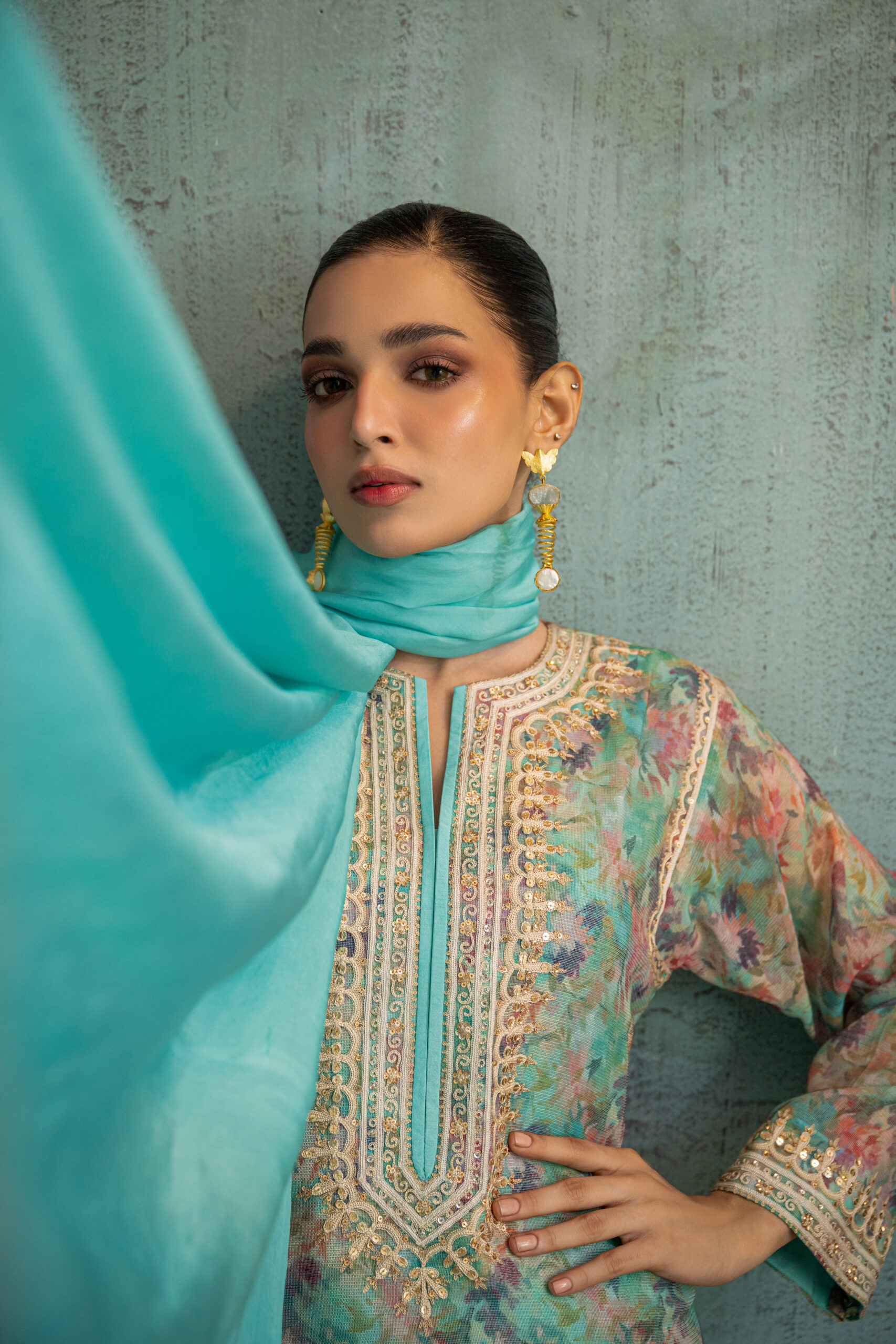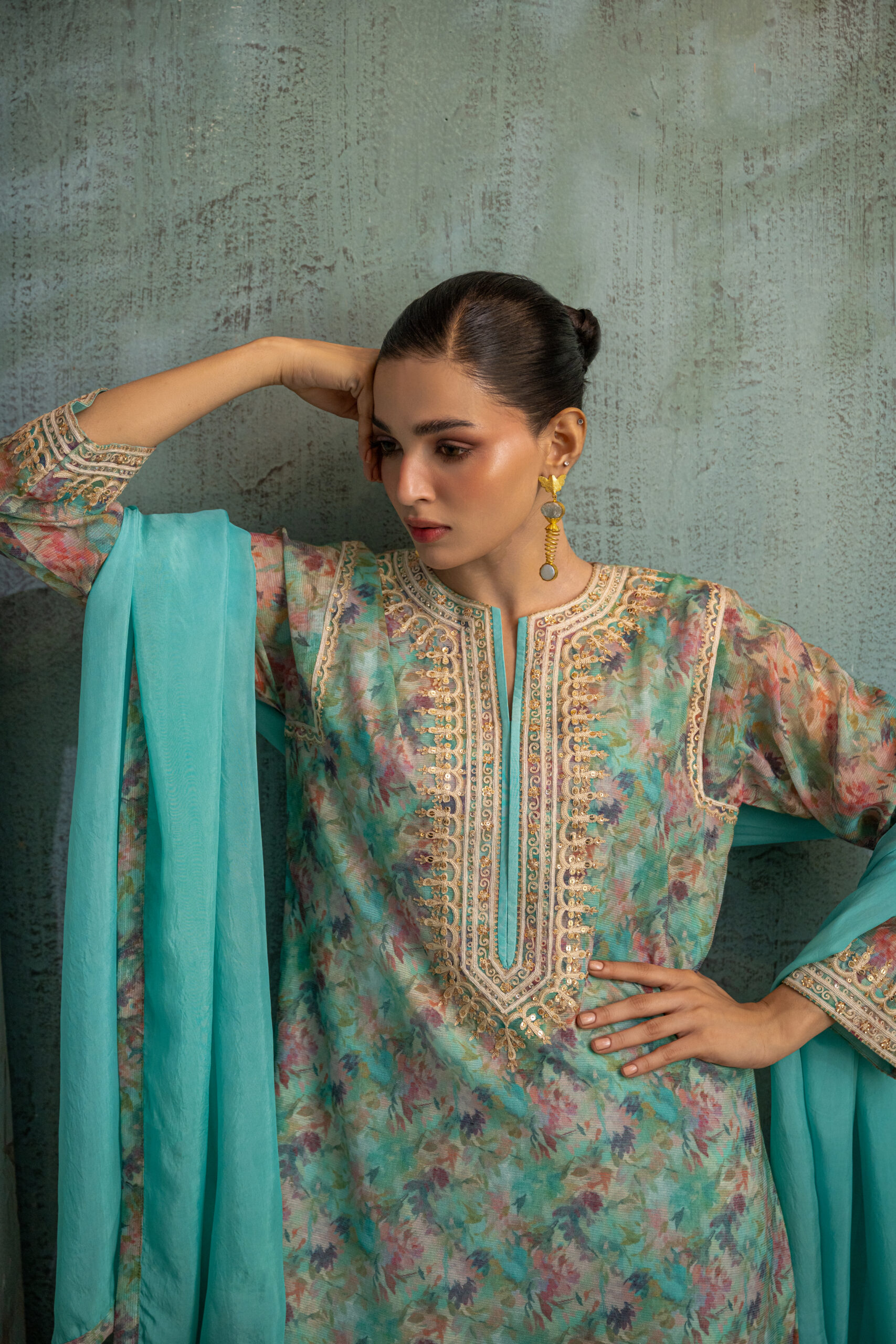 Aqua blue khadi net multi printed shirt, adorned with beige aari embroidery and shimmering gold sequins on neckline and sleeves. The armhole sleeves and pants feature delicate beige lace accents, while the back is elegantly detailed with aari motifs and gold sequins. Paired with printed culotte pants and a aqua silk dupatta to complete the look.