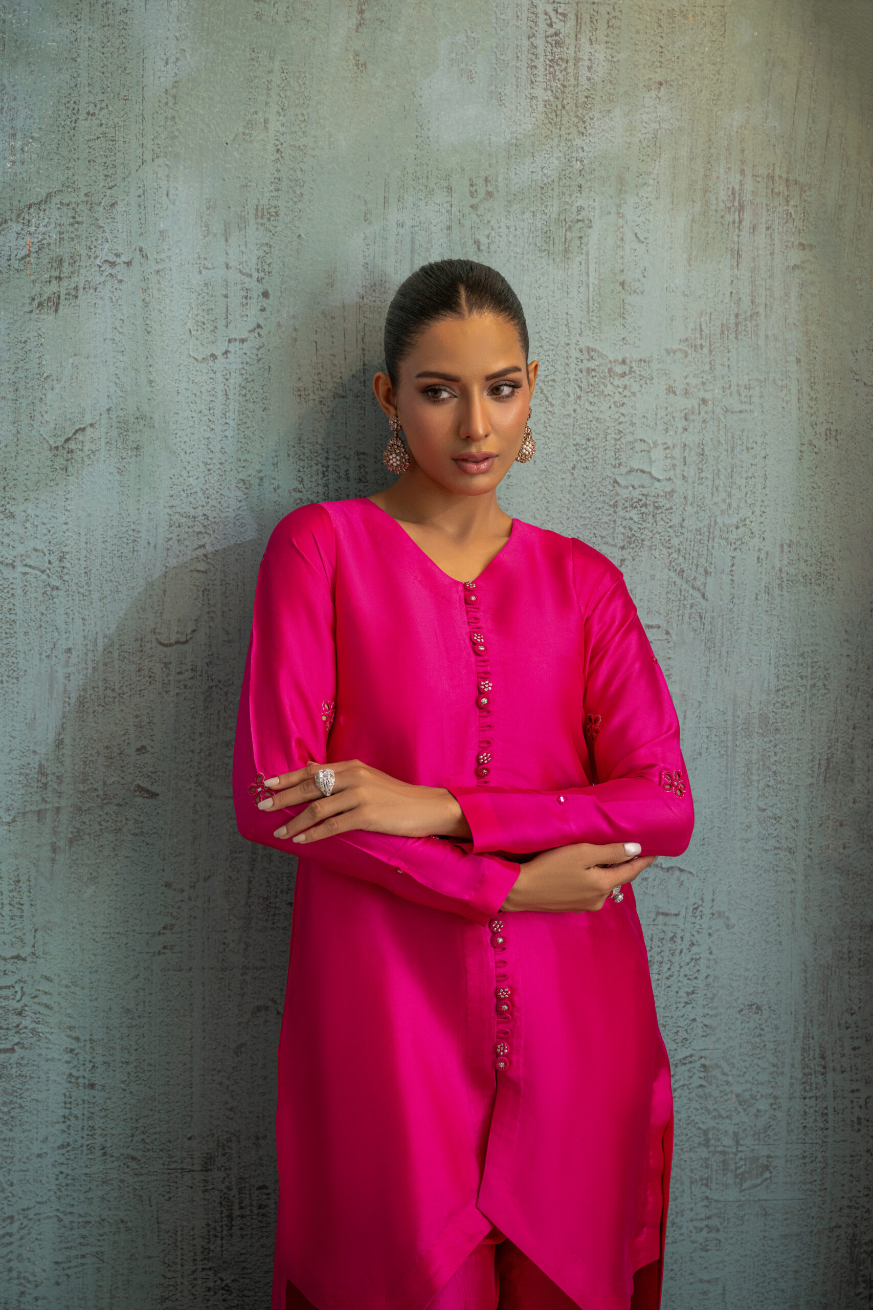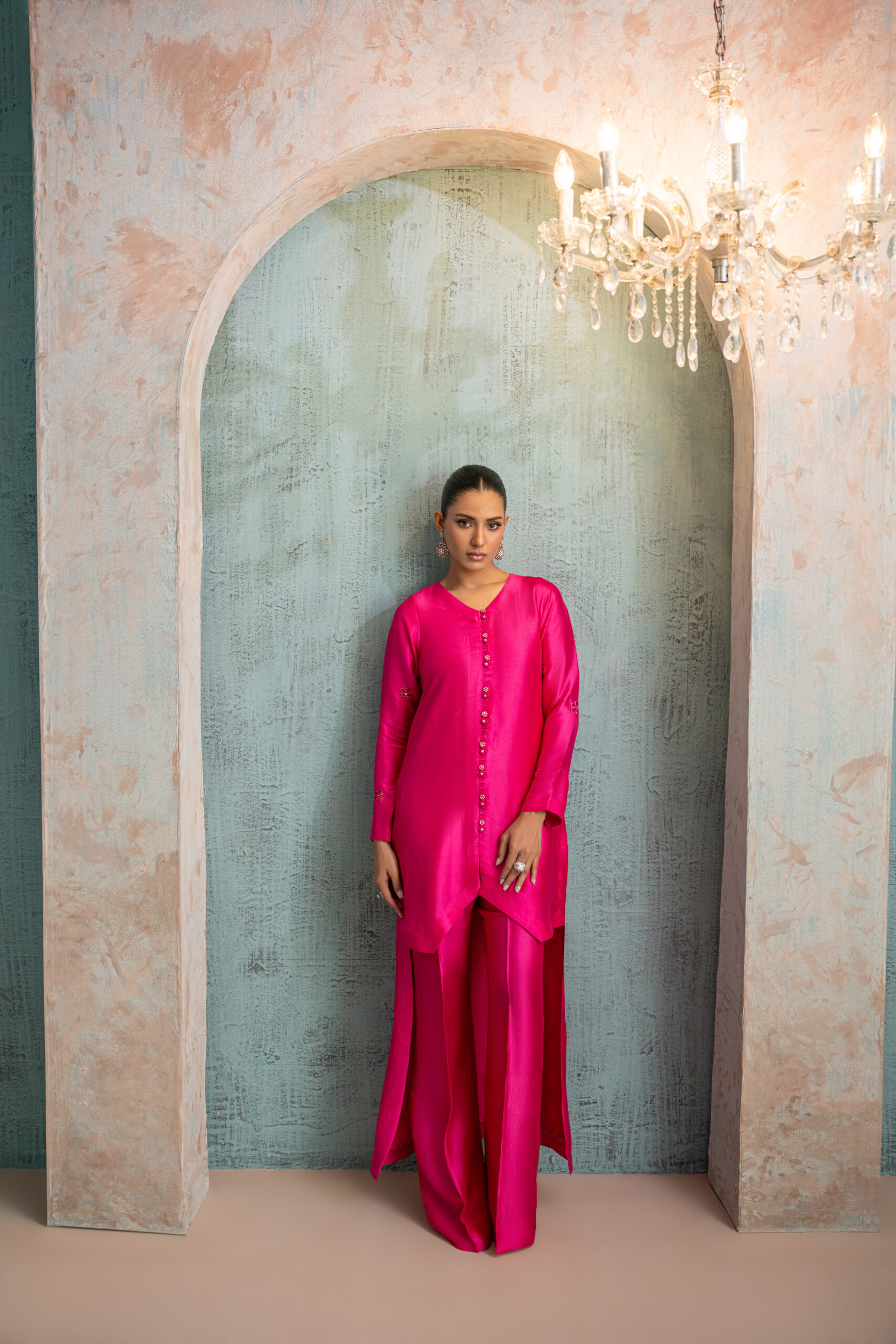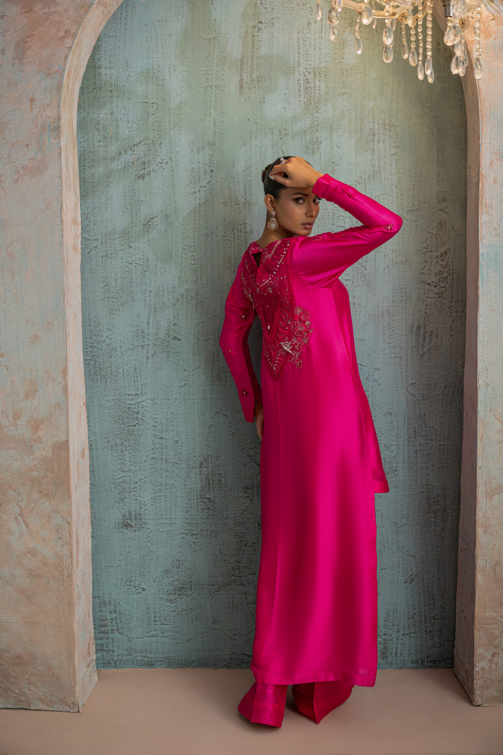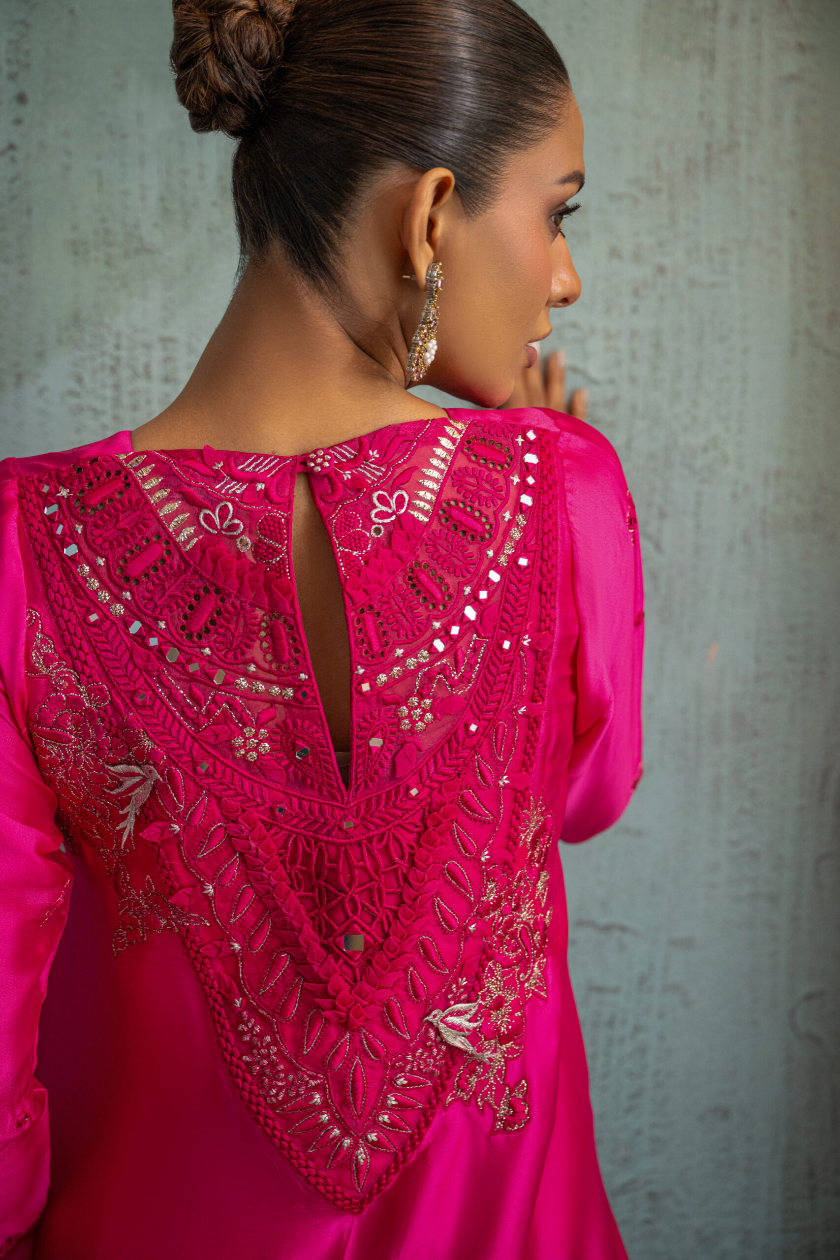Hot pink high-low buttersilk shirt featuring a button down front and a beautifully embroidered statement back V-shaped neckline with resham and zari work cutwork, enhanced with 3D organza accents. The outfit is paired with slightly wide legged pants. A perfect statement piece for Ramadan or summer Eid evenings.