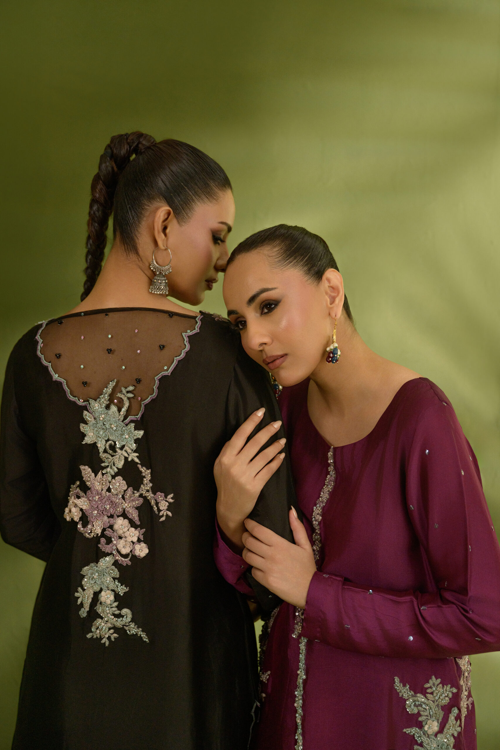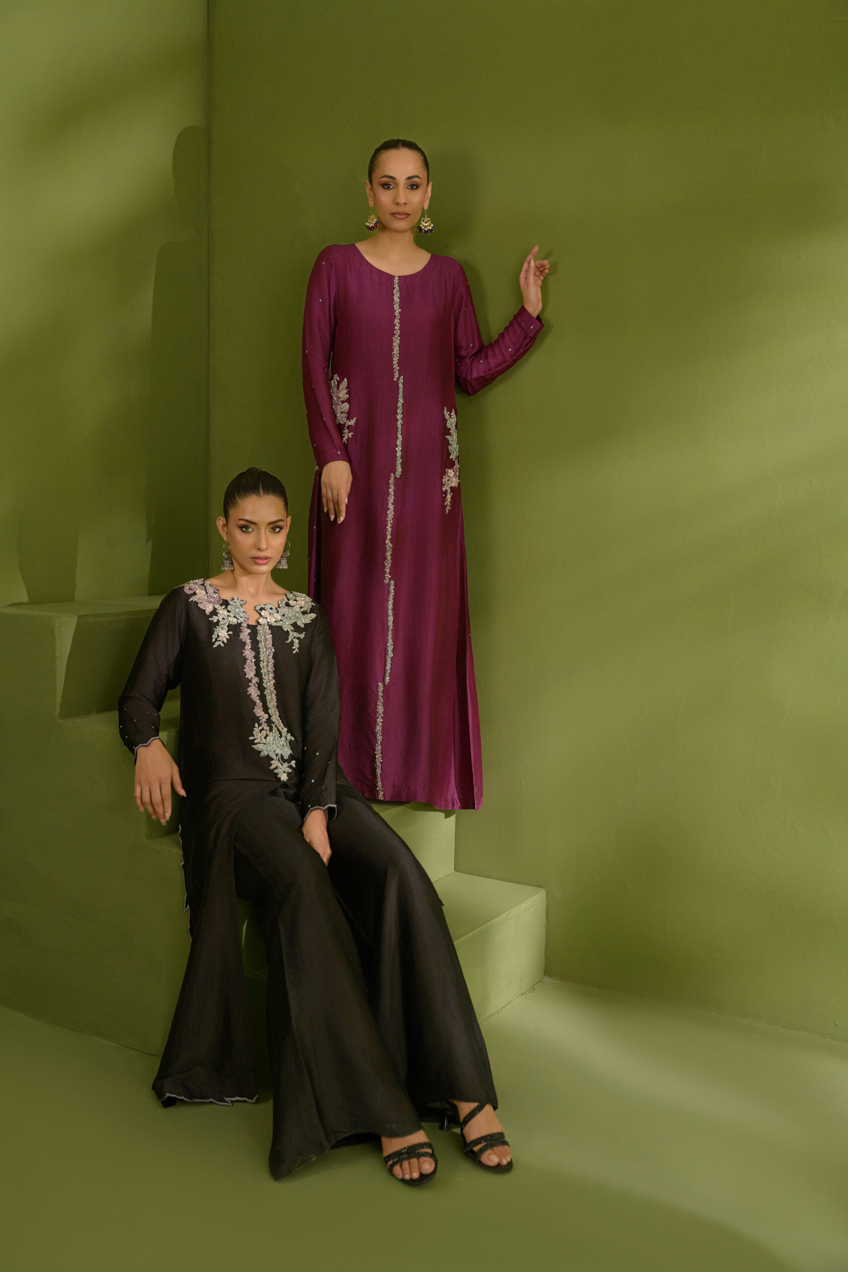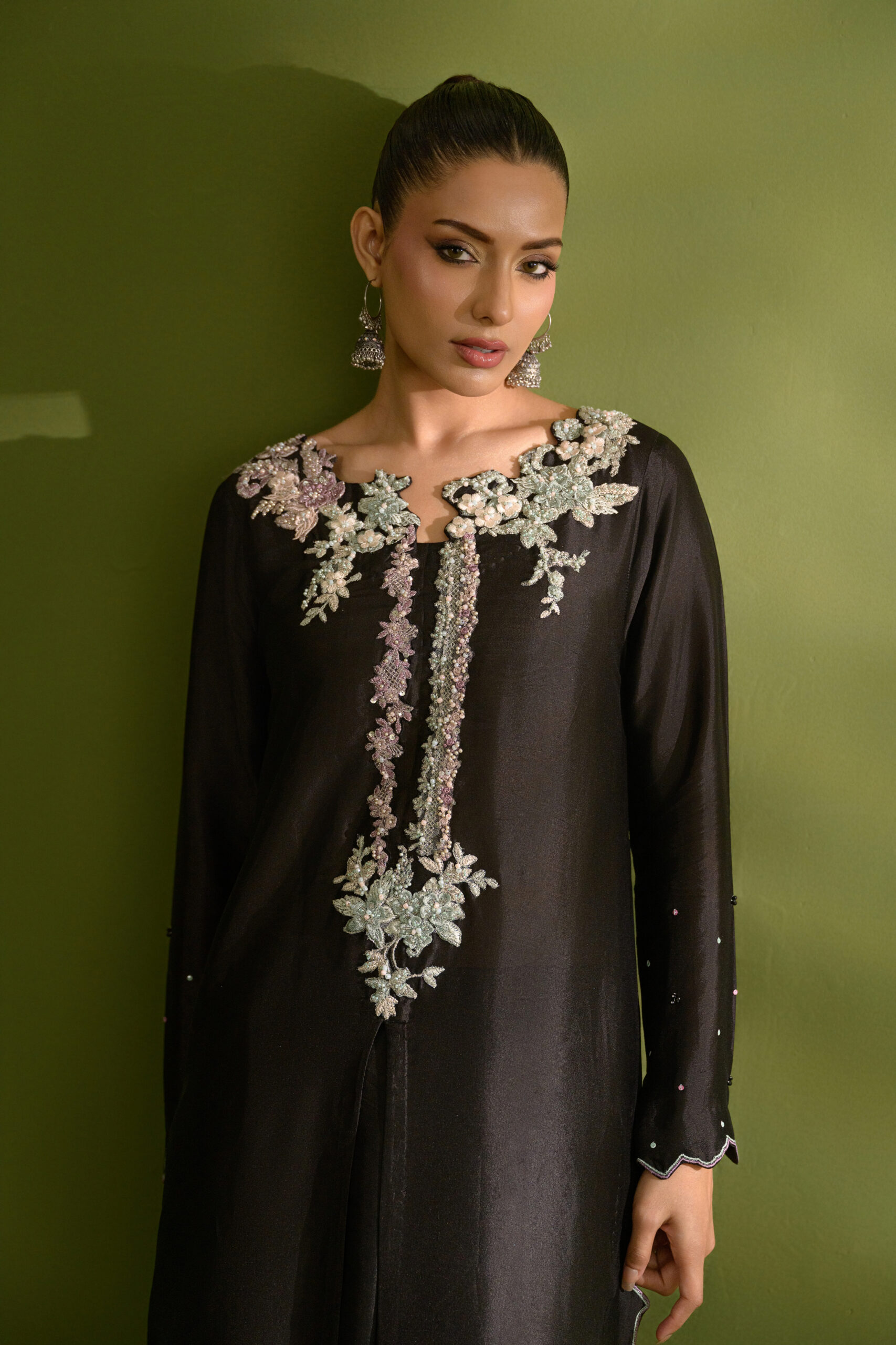 A black buttersilk long front-open shirt featuring intricate Lilac and mint colored bead and sequin work with delicate 3D floral detailing along the front and back neckline. Paired with flared pants and a color-block silk dupatta, this look is perfect for an elegant evening out.