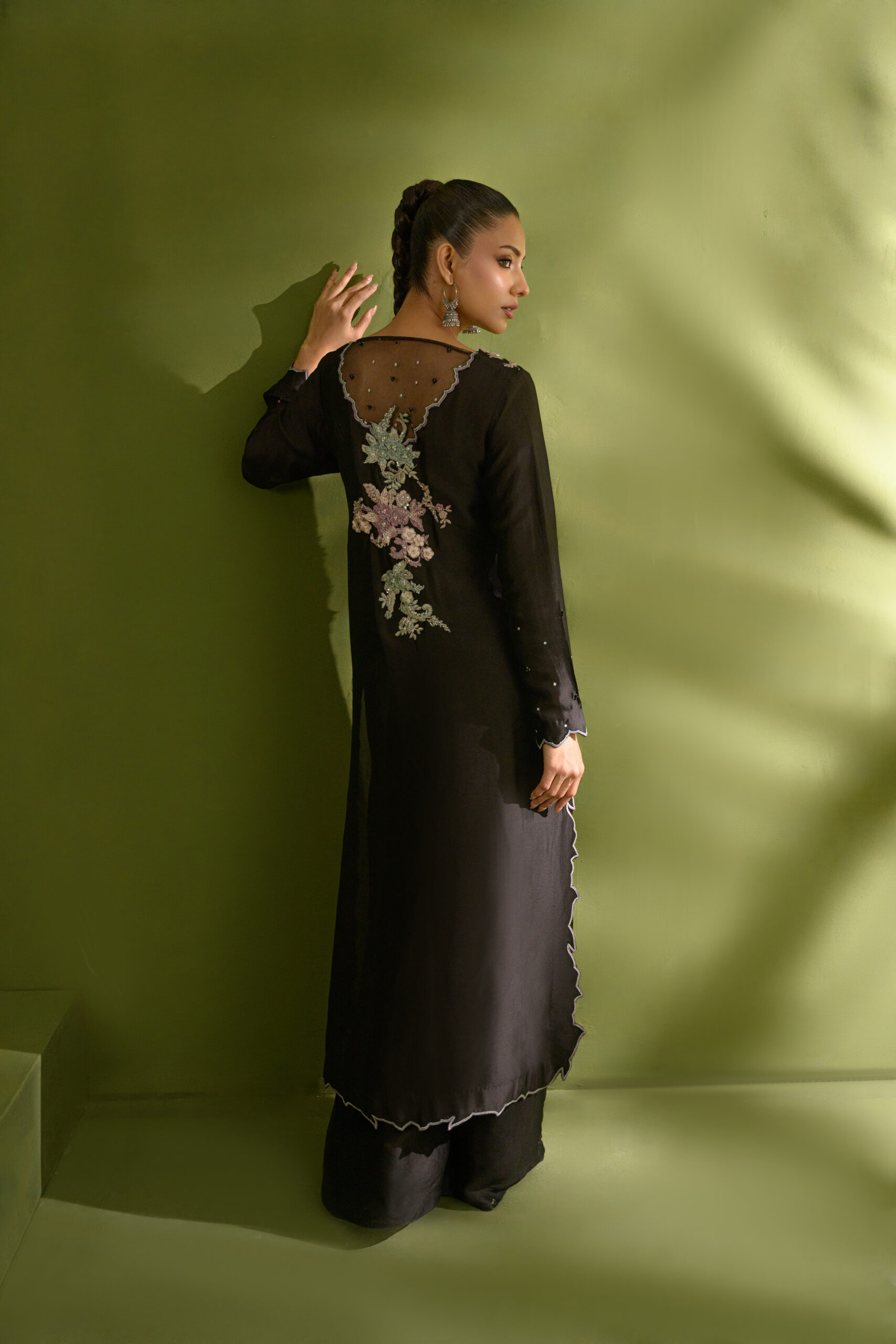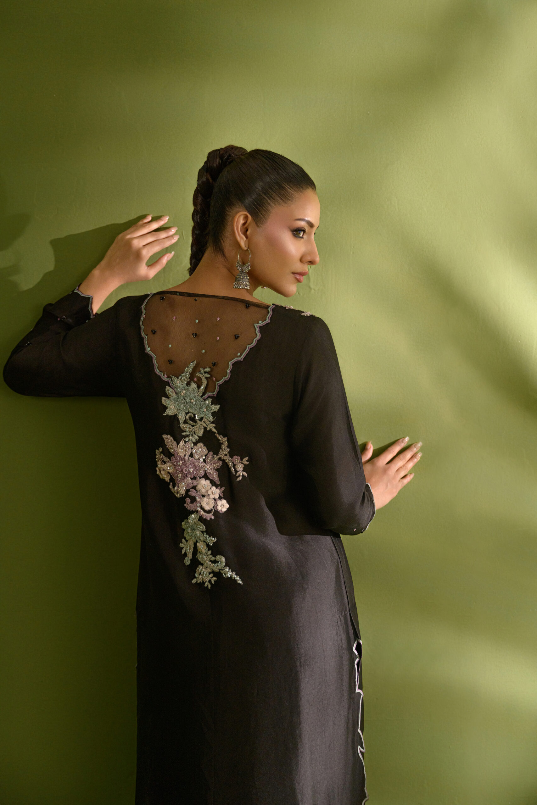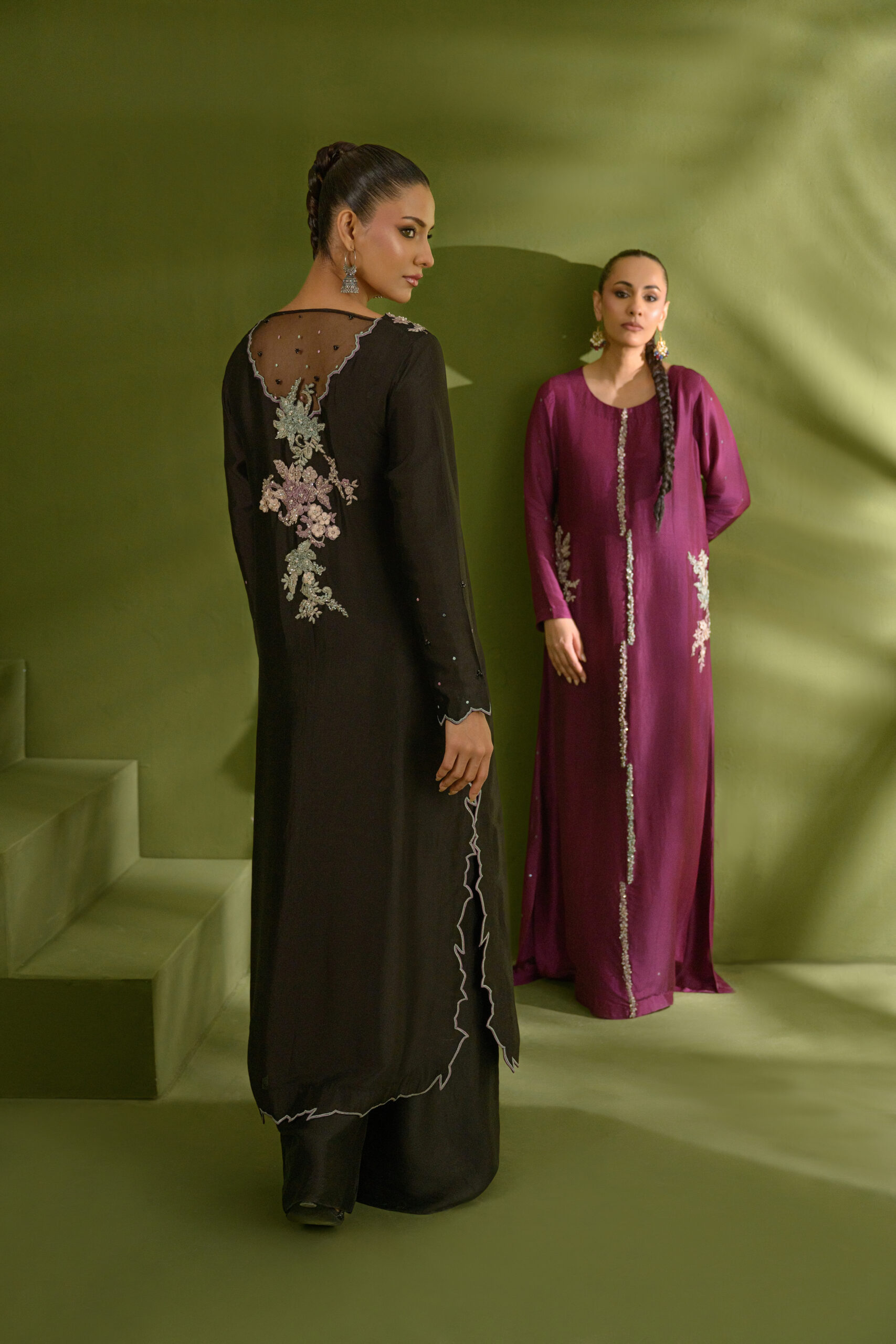 A black buttersilk long front-open shirt featuring intricate Lilac and mint colored bead and sequin work with delicate 3D floral detailing along the front and back neckline. Paired with flared pants and a color-block silk dupatta, this look is perfect for an elegant evening out.