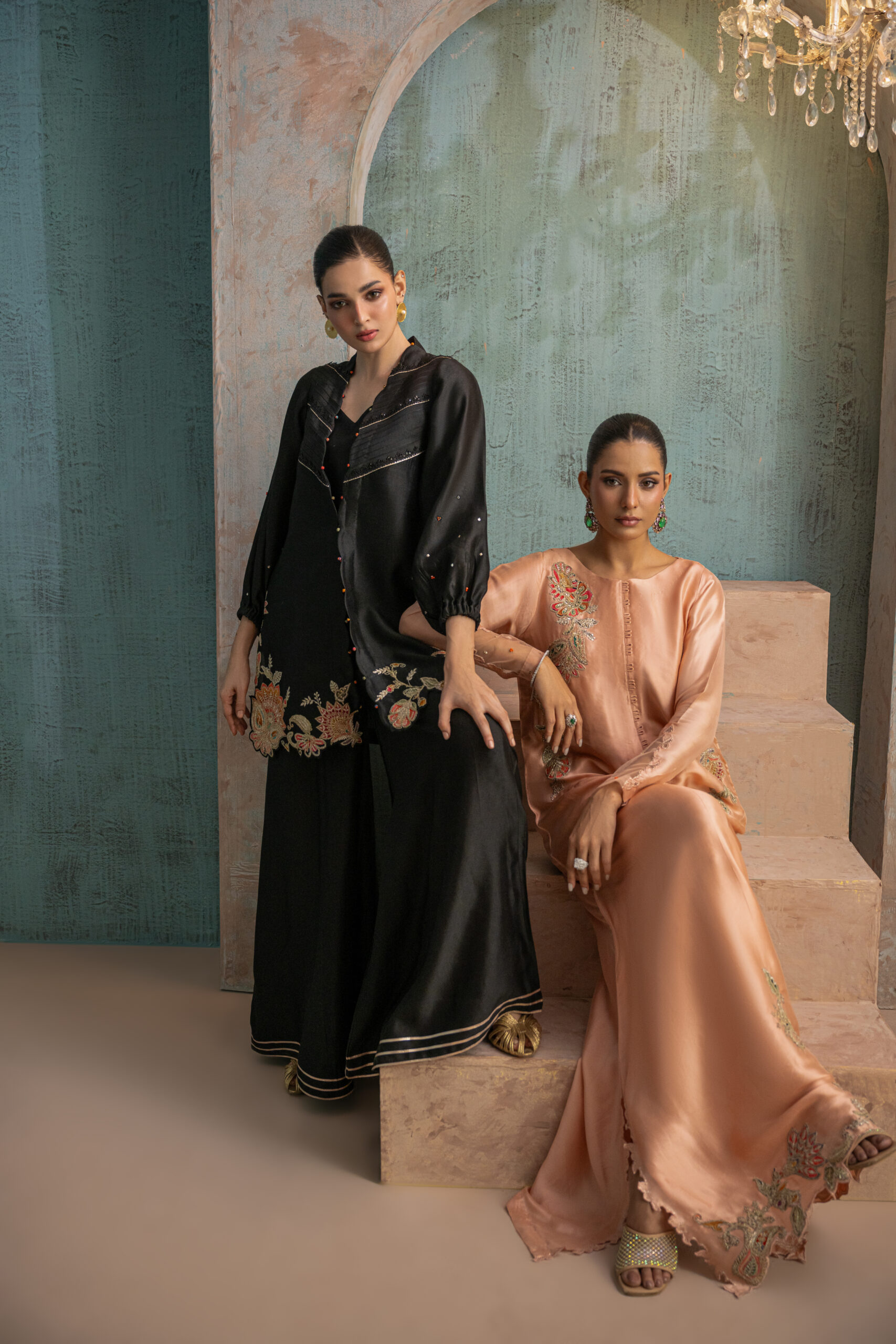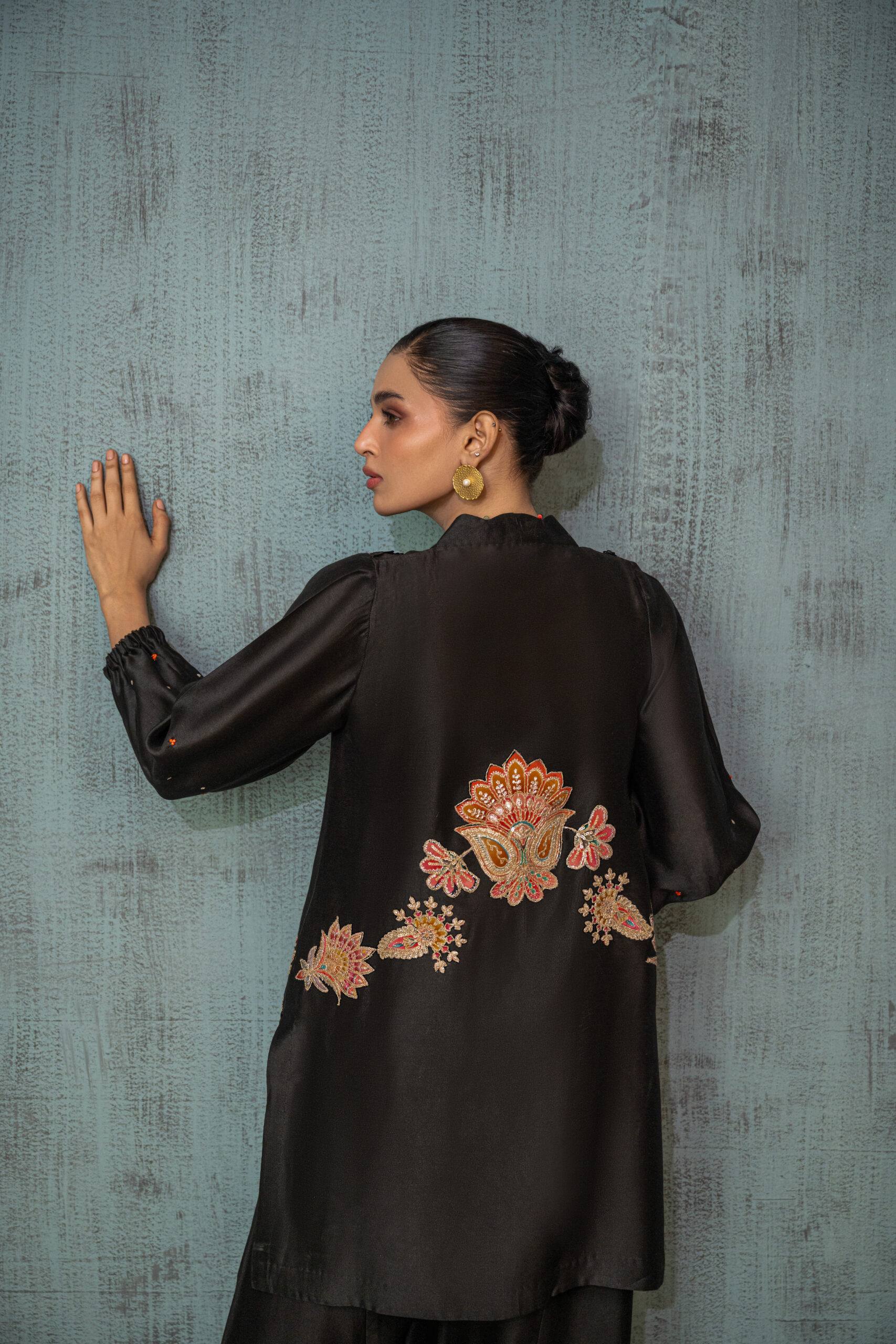 Crafted in rich almond brown sheesha silk, this A-line short top enhanced with velvet appliqué and exquisite zari 3D scallop embroidery, finished with subtle stone detailing on hem. A graceful neckline completes the look, paired with a khari shalwar and flowy chiffon dupatta.