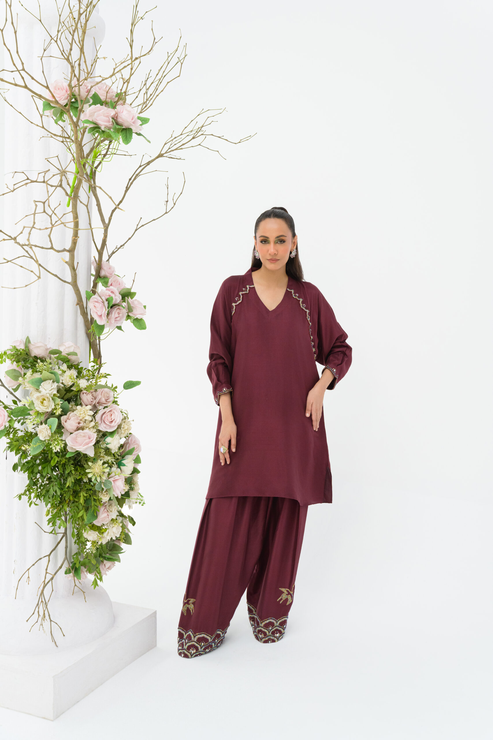 Beautiful wine color pure rawsilk 80gms raglan baggy top with multi stone work around the neckline and sleeves. This outfit is paired with a farshi shalwar with heavy stone and beadwork embroidery on the paincha. Also includes organza dupatta with multi stone chun.
