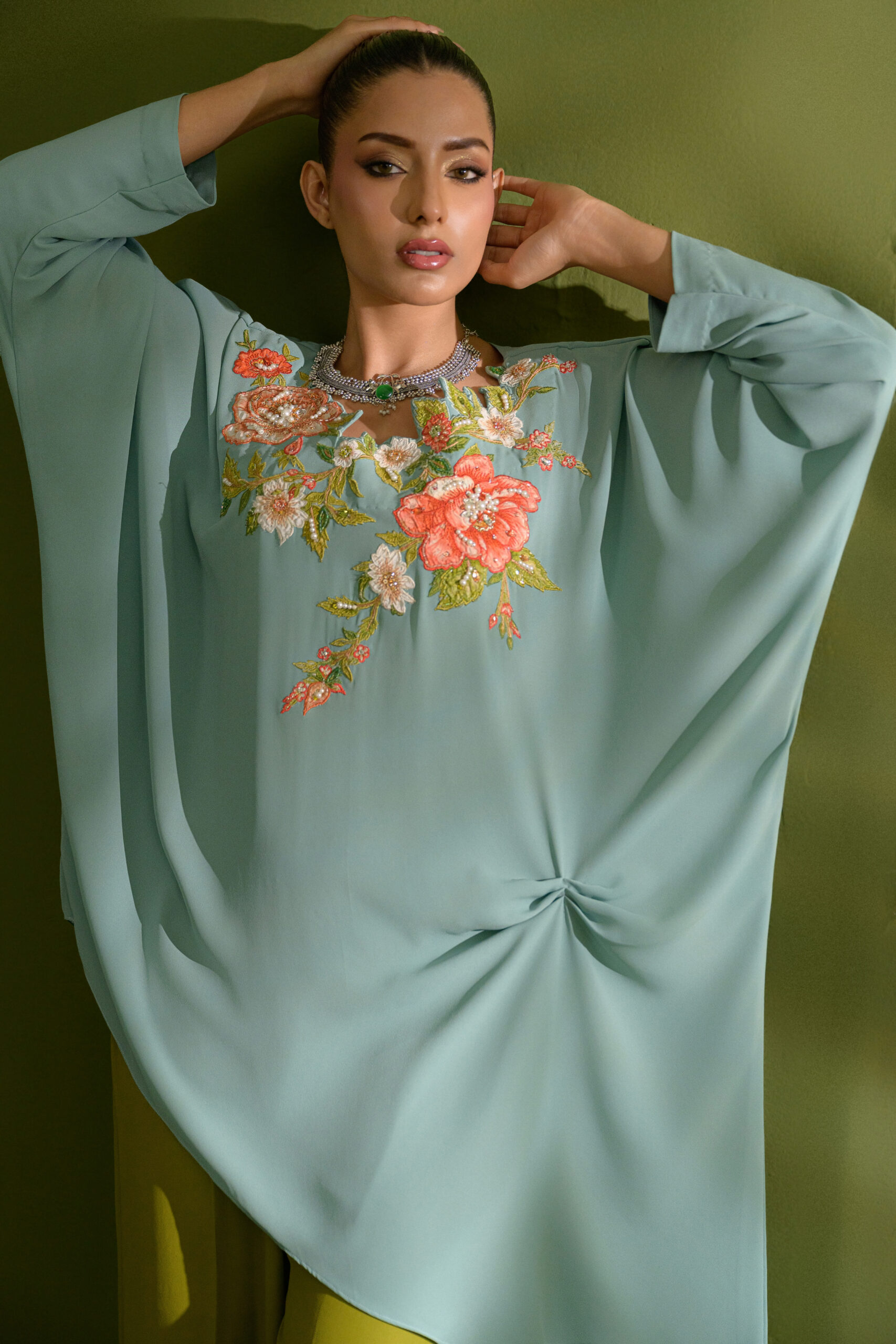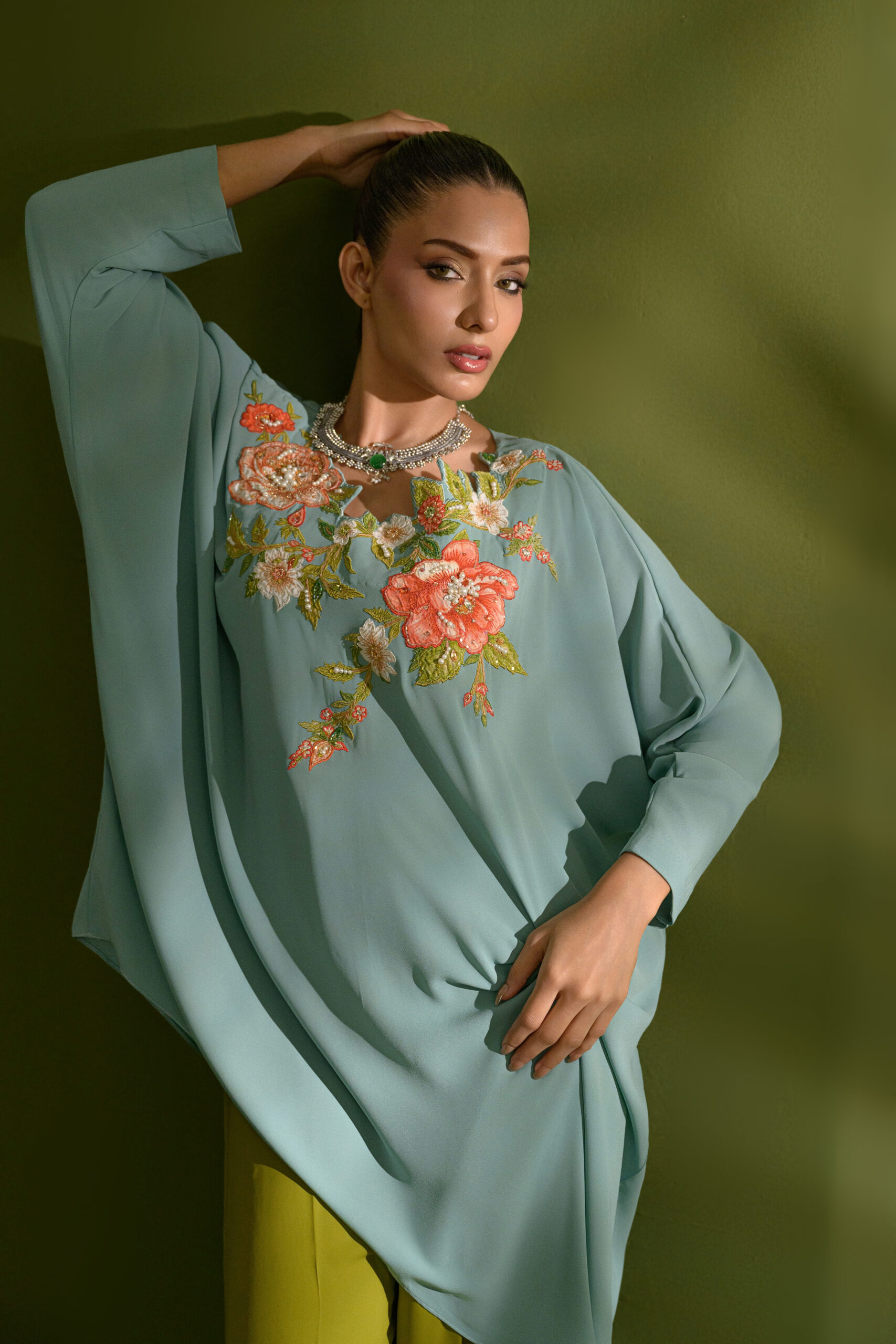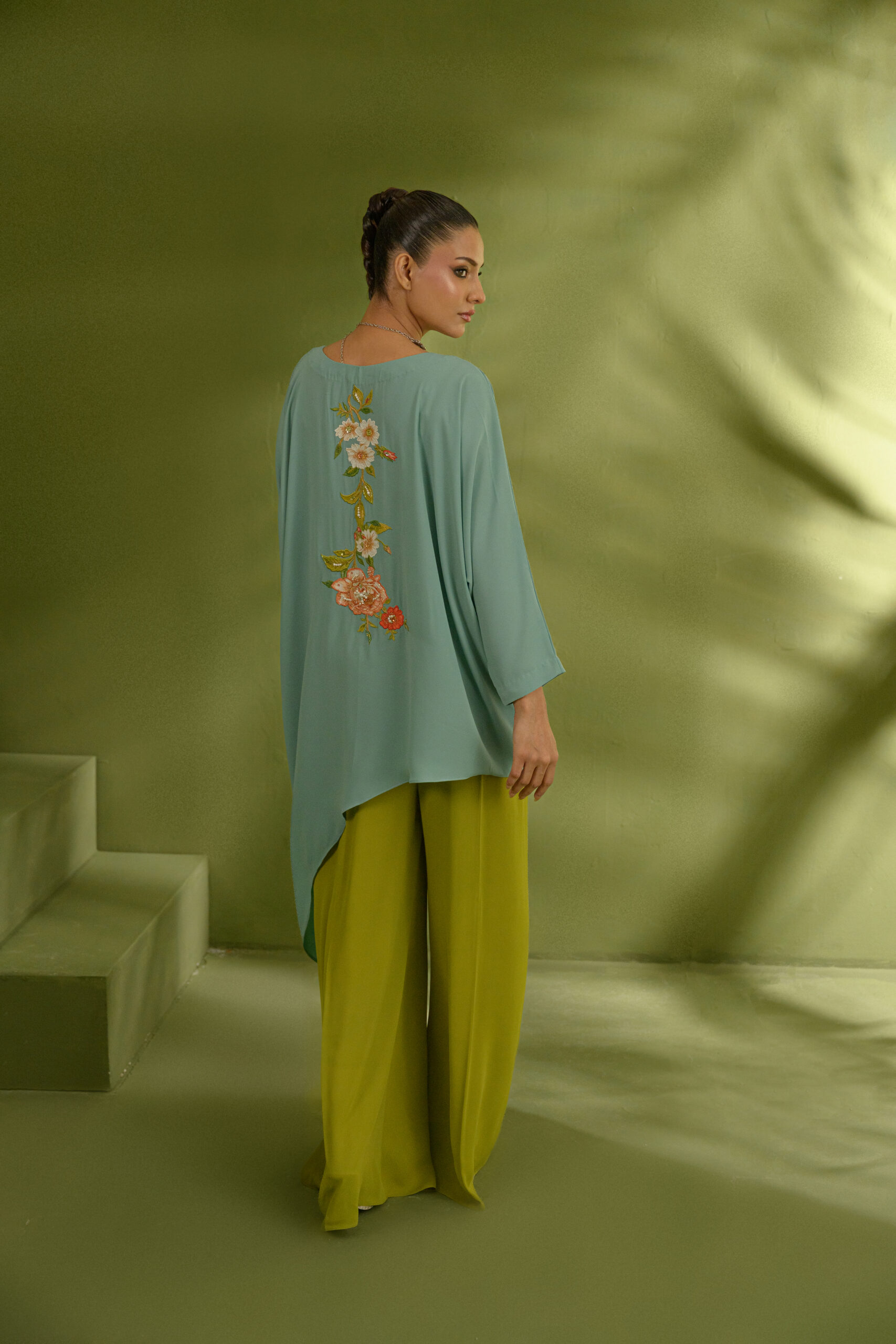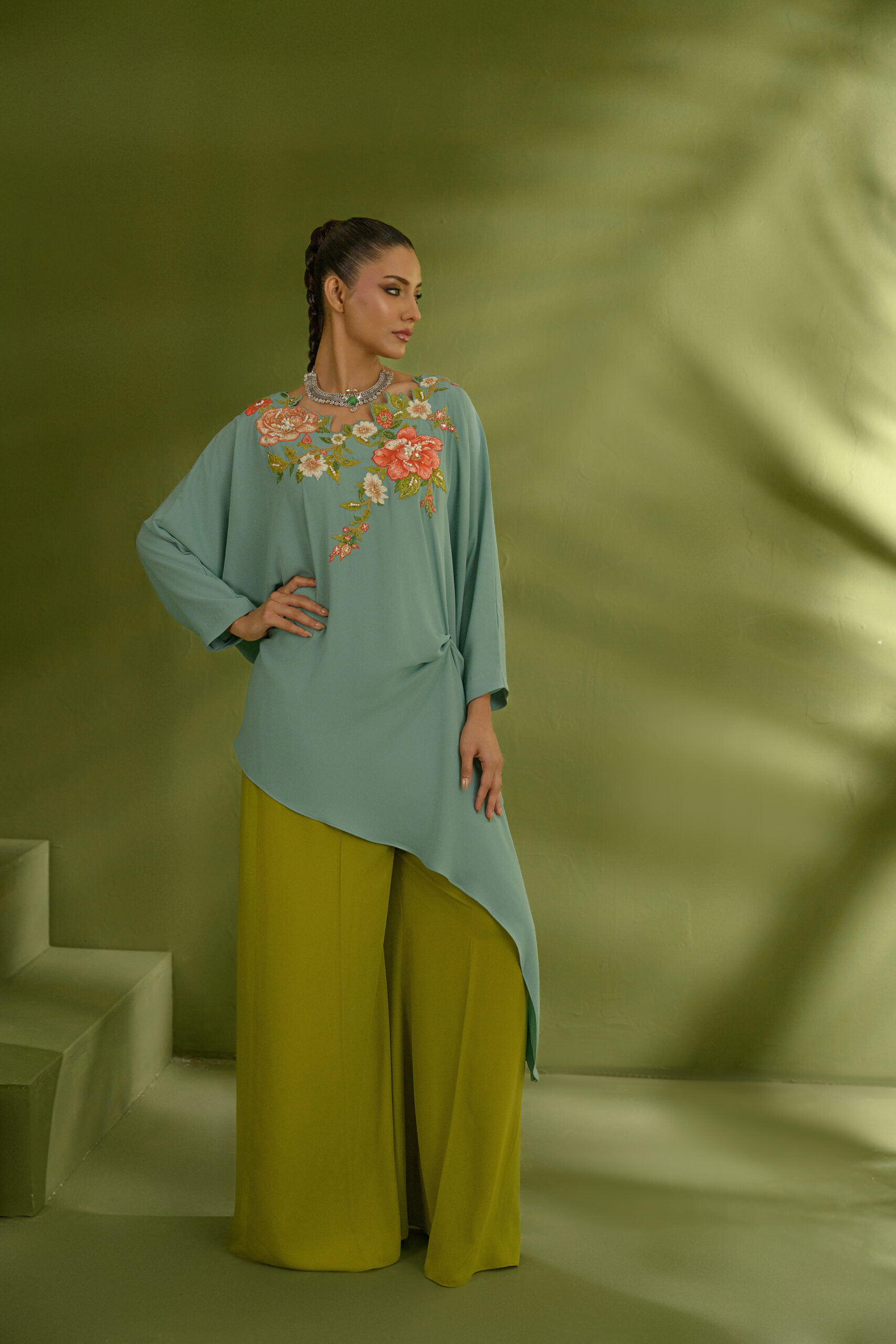 An asymmetrical blue georgette box top, delicately adorned with rose and daisy appliqué and fine hand embellishment at neckline, finished with a graceful stem-drop embroidered back. Paired with lime green flared pants.