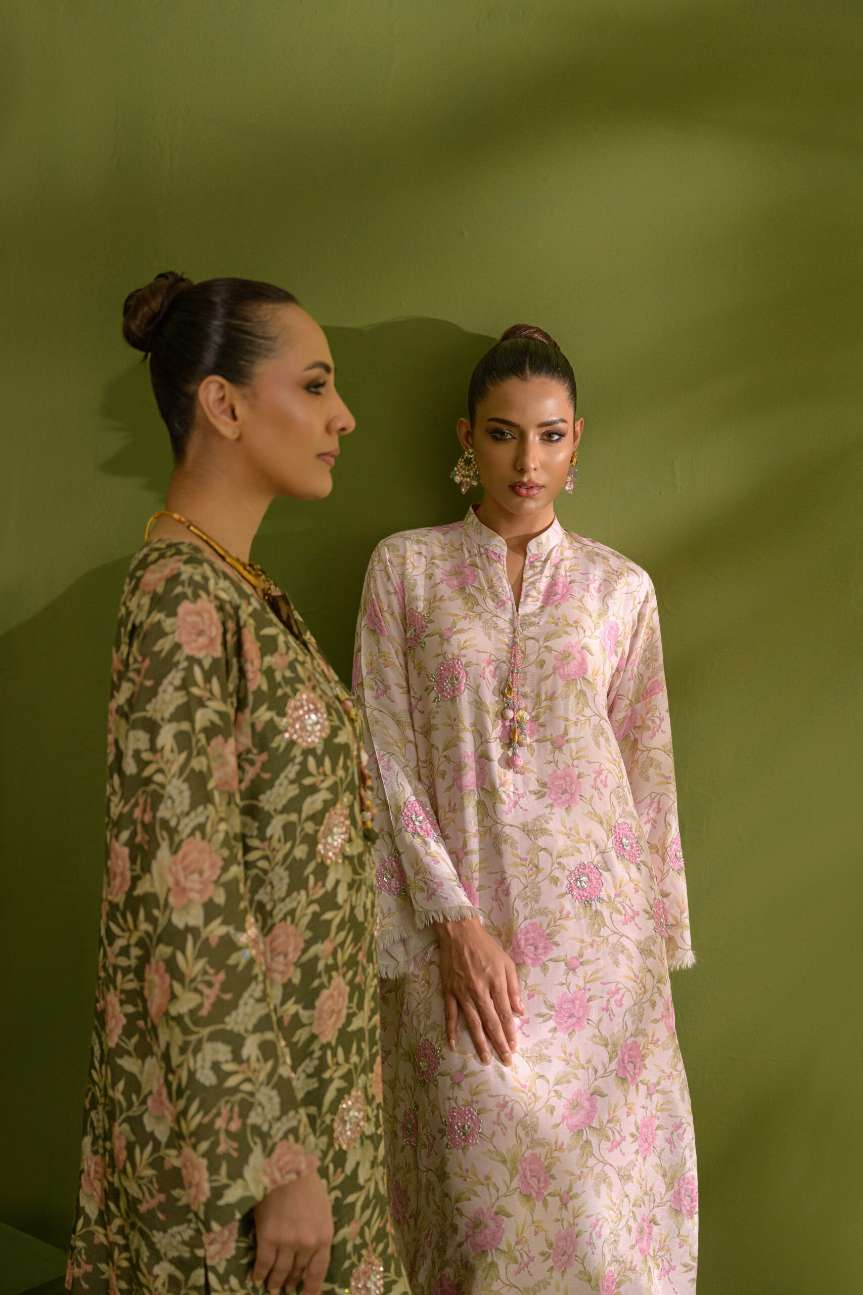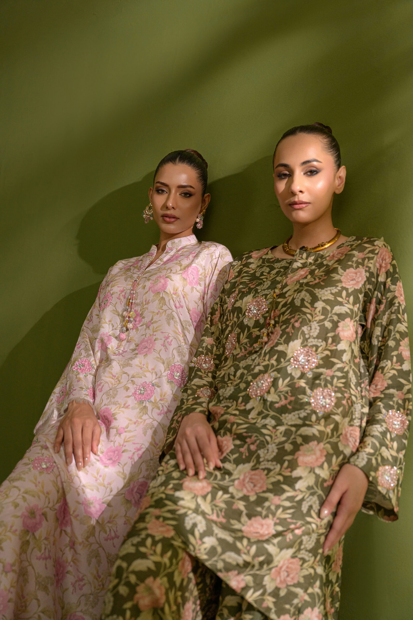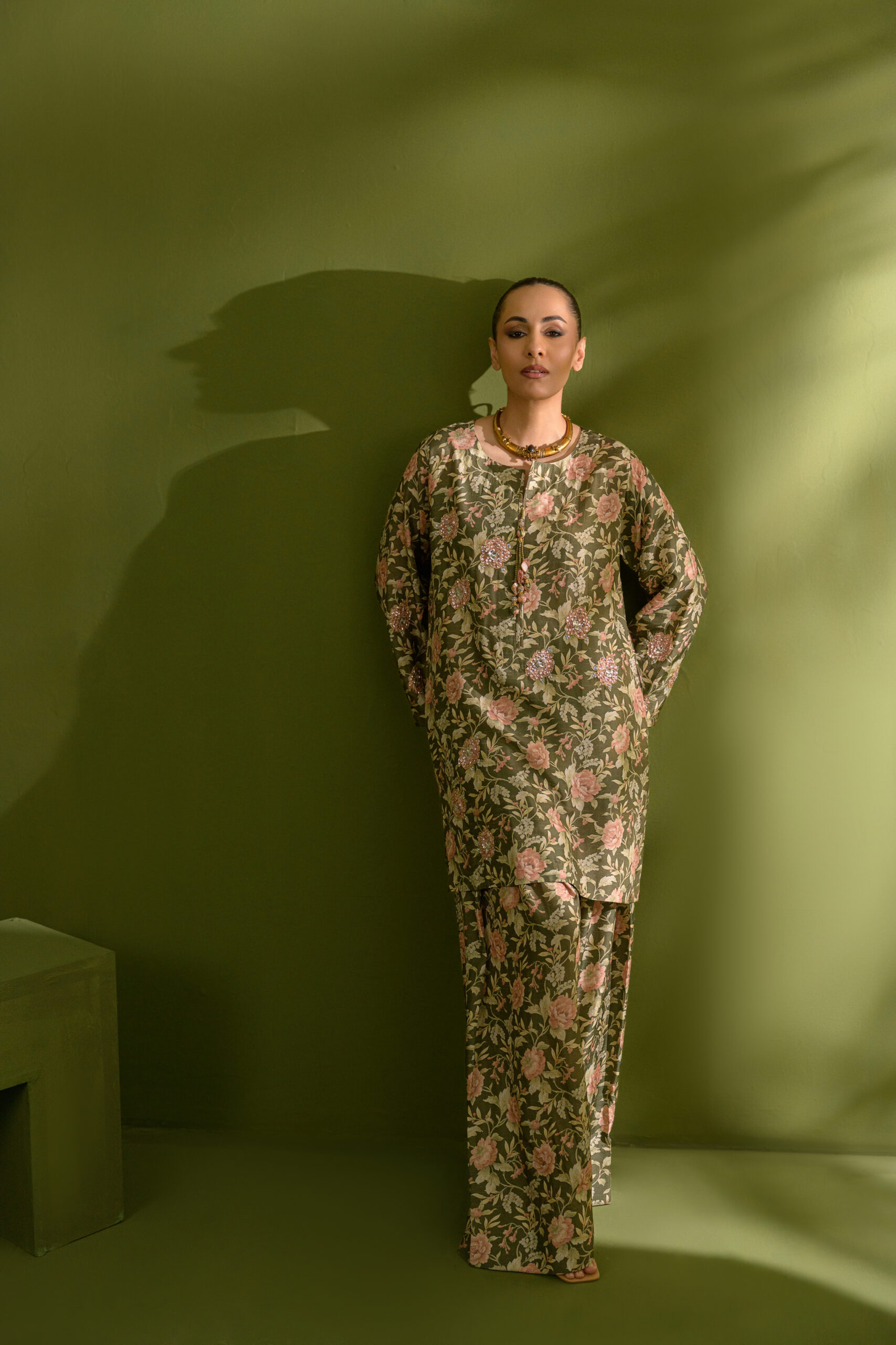 An olive green and almond floral-printed co-ord set featuring a relaxed, baggy-cut shirt and a flowing farshi shalwar, beautifully accentuated with sequins and beadwork highlighting the florals—an effortless summer look.