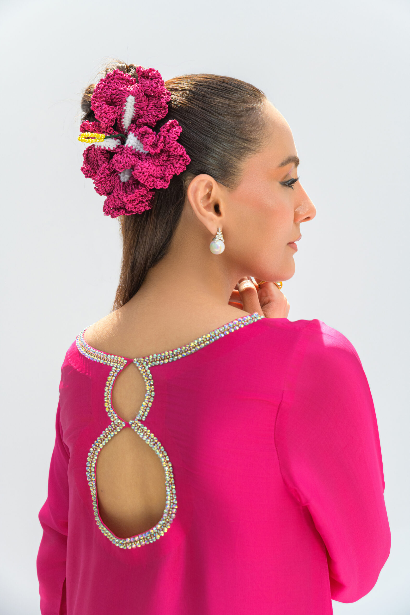 Bold and Beautiful hotpink A line butter silk long shirt with multi stone detailing on the front and back neckline, sleeves and side slits. This outfit is paired with wide legged pants and organza dupatta with stone work chun.