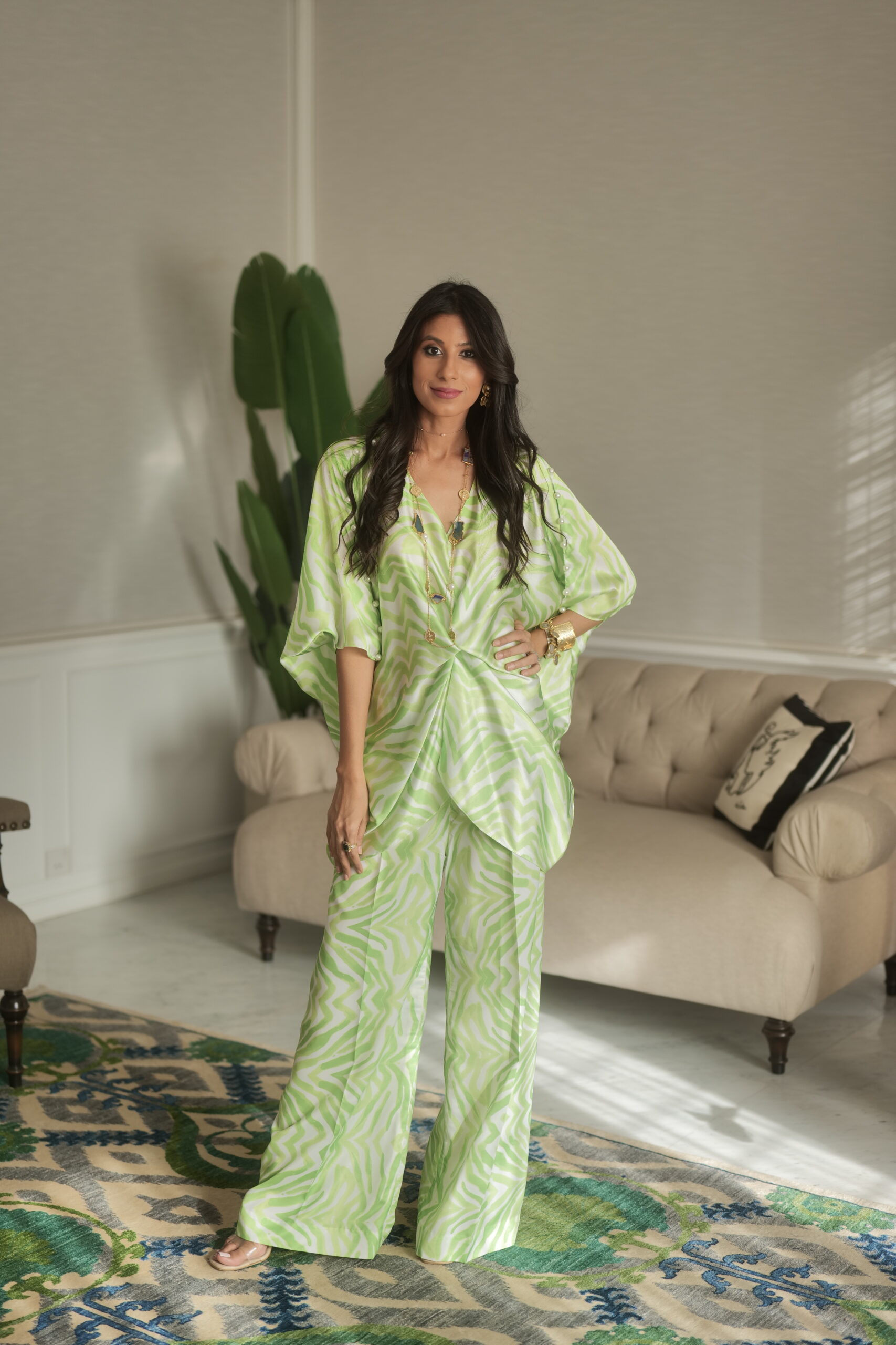 Chic summery printed silk Co-ord set with pearl details perfect for your fancy evenings out!