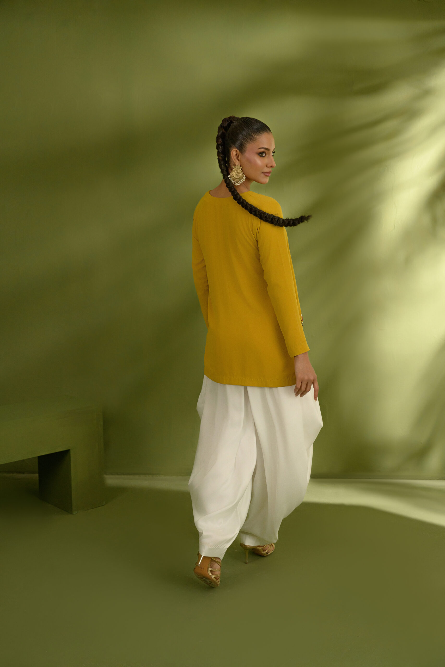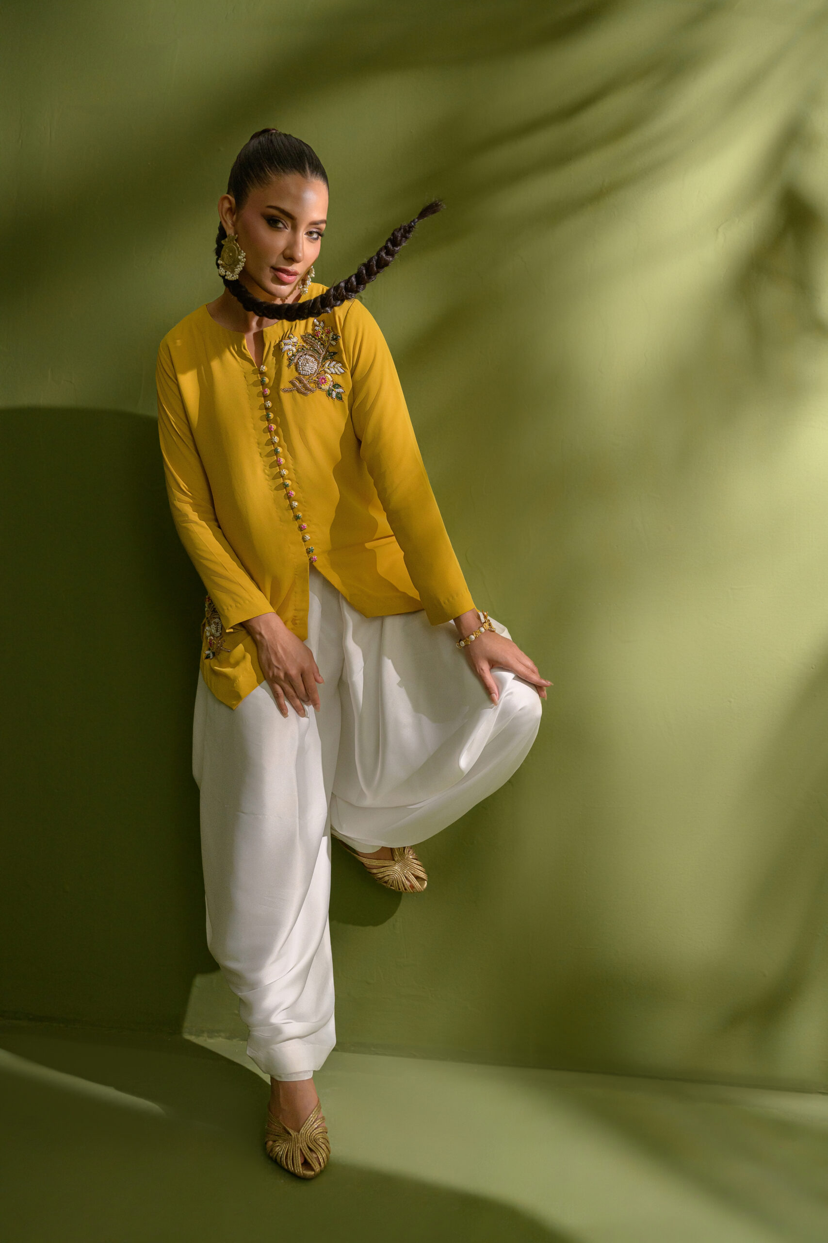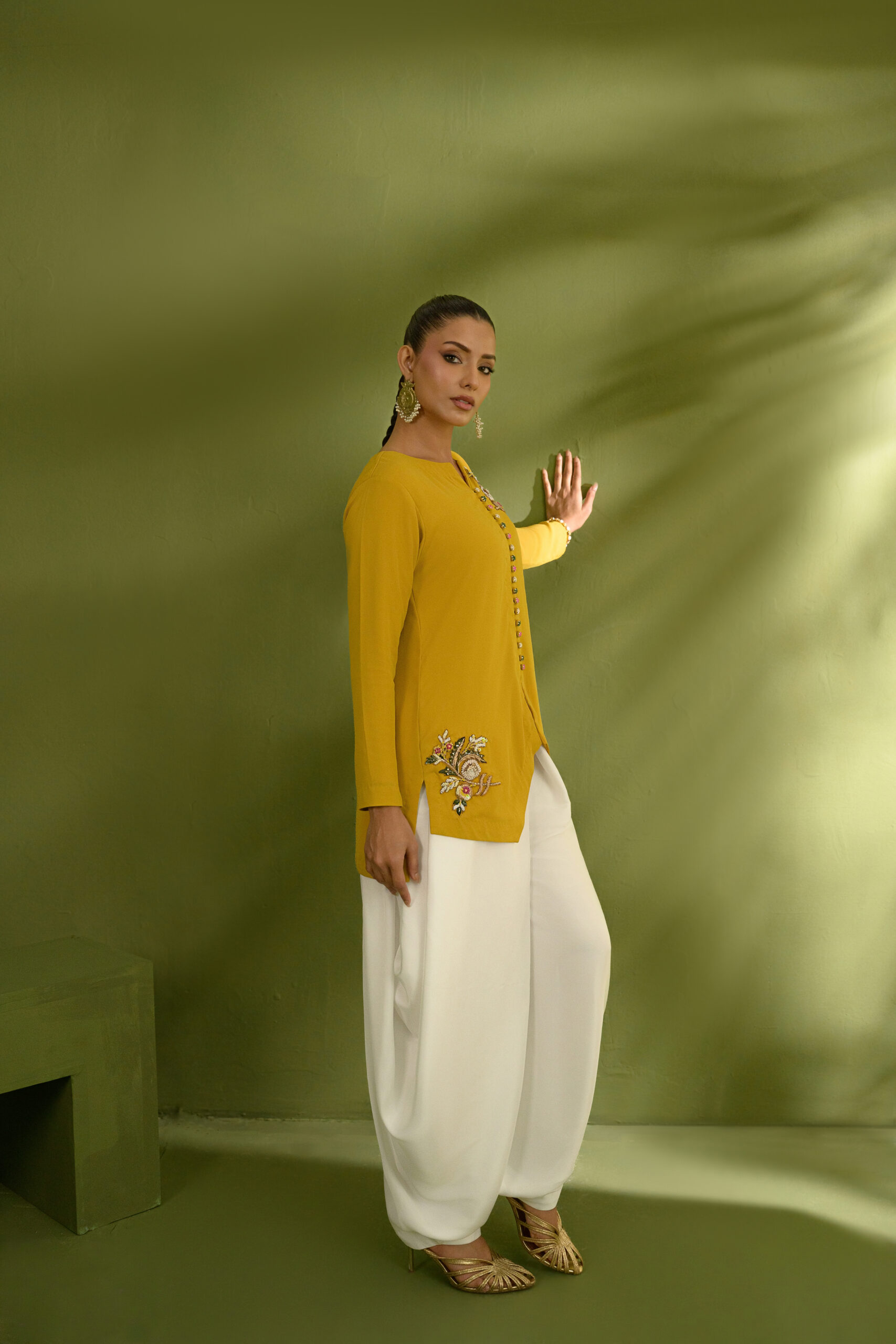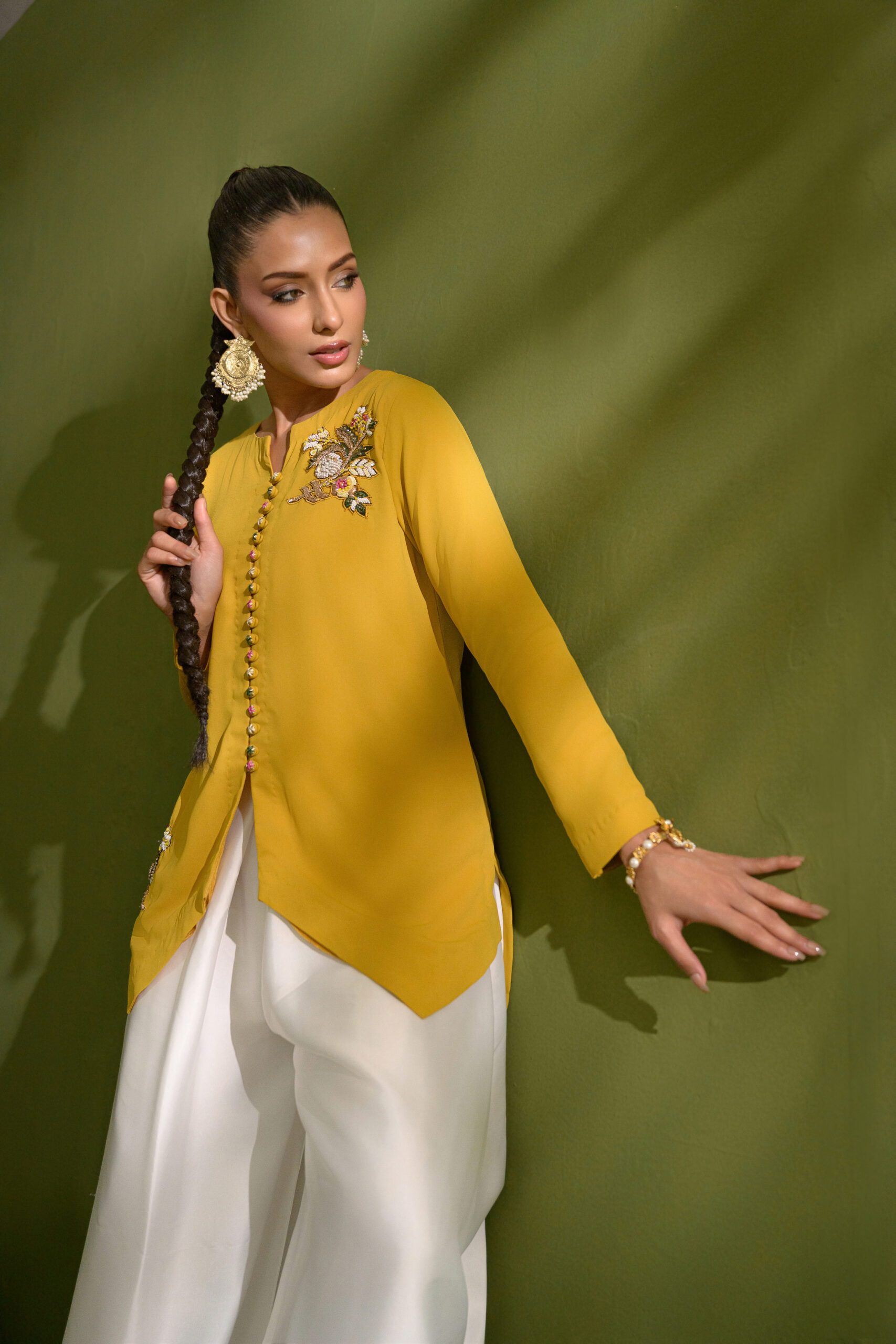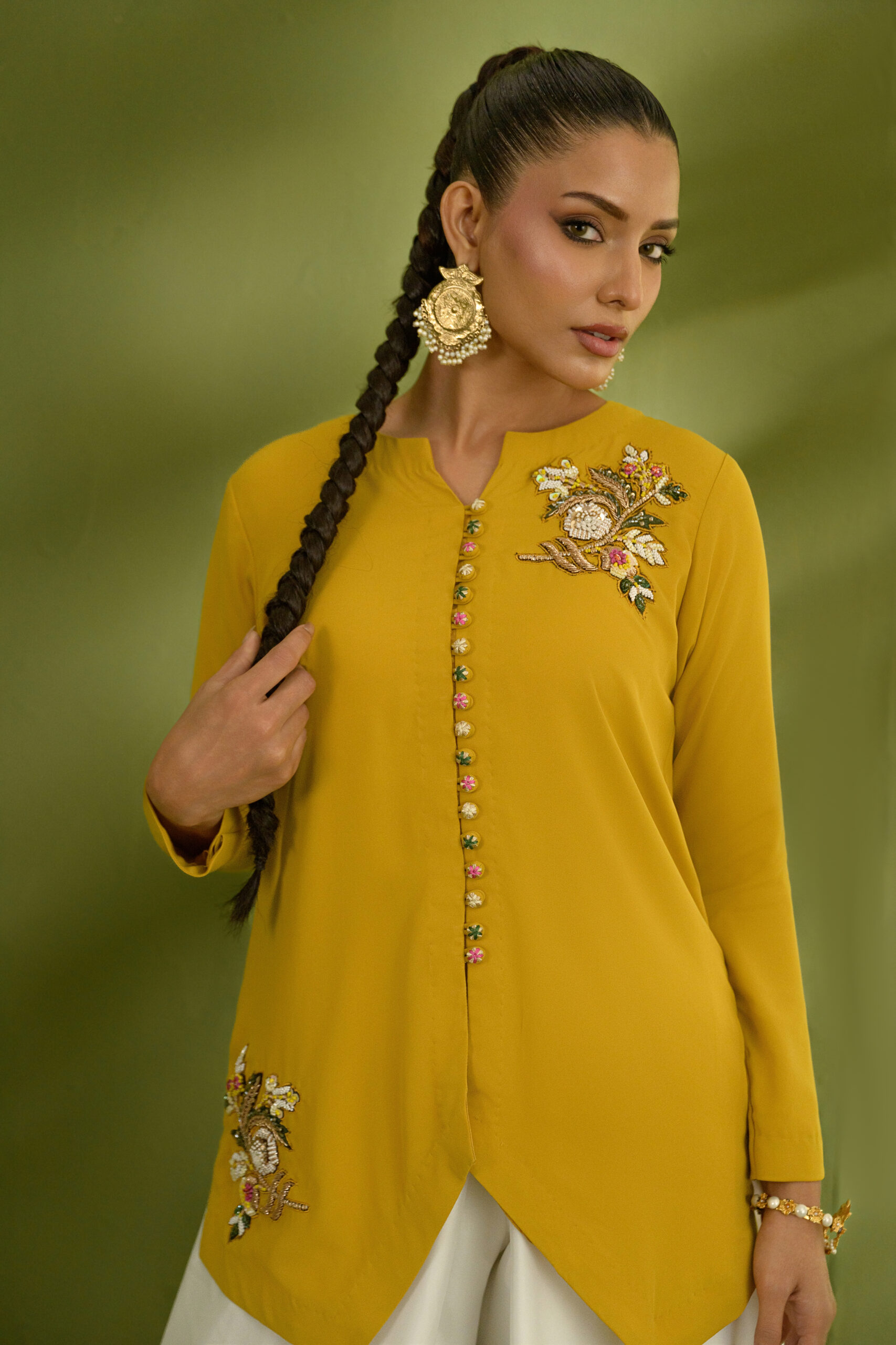 A mustard yellow, modern button-down jacket featuring a sharp V-shaped hemline, adorned with intricate handworked motifs along the shoulders and hem. Paired with a contemporary draped shalwar pant for a refined, statement look.