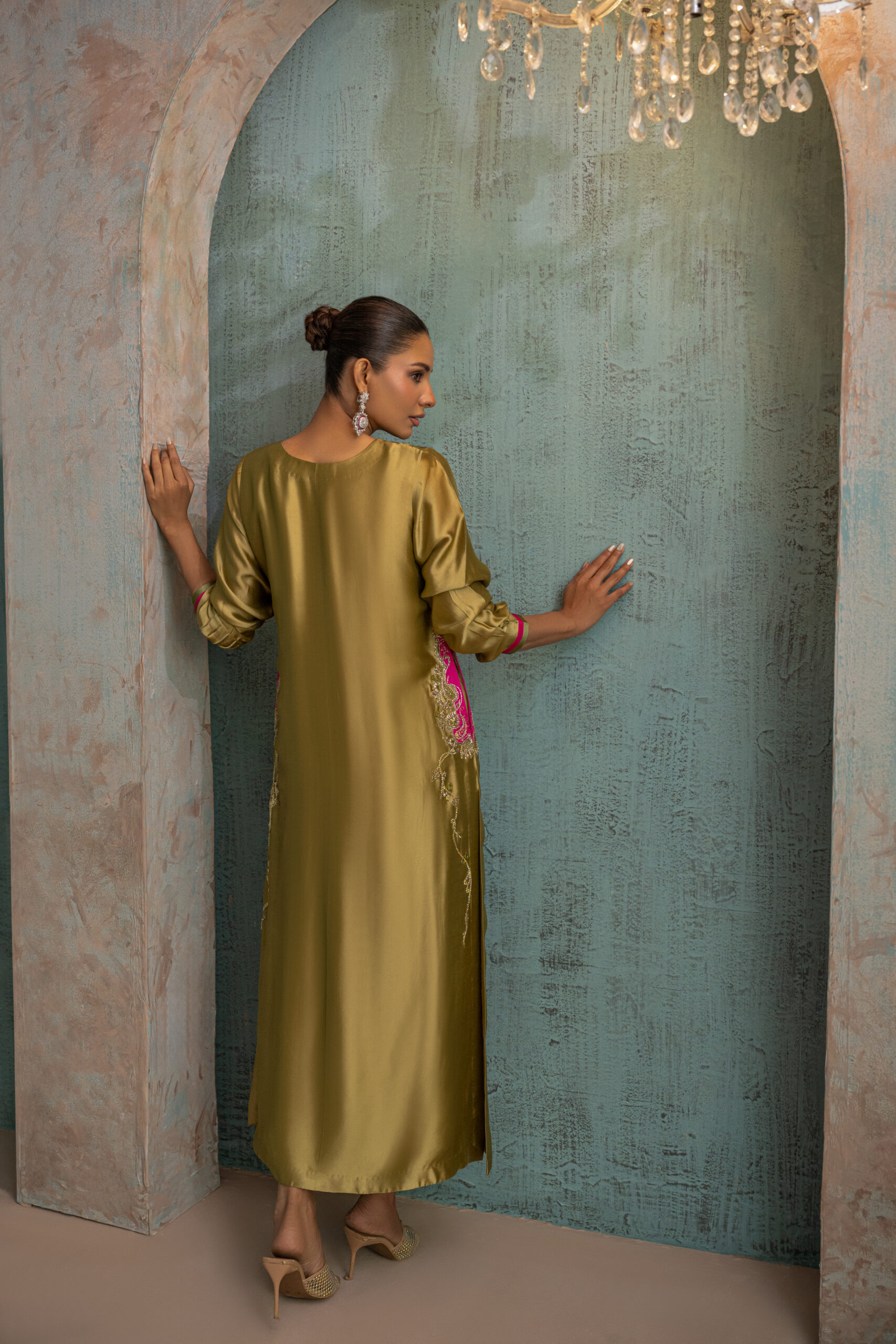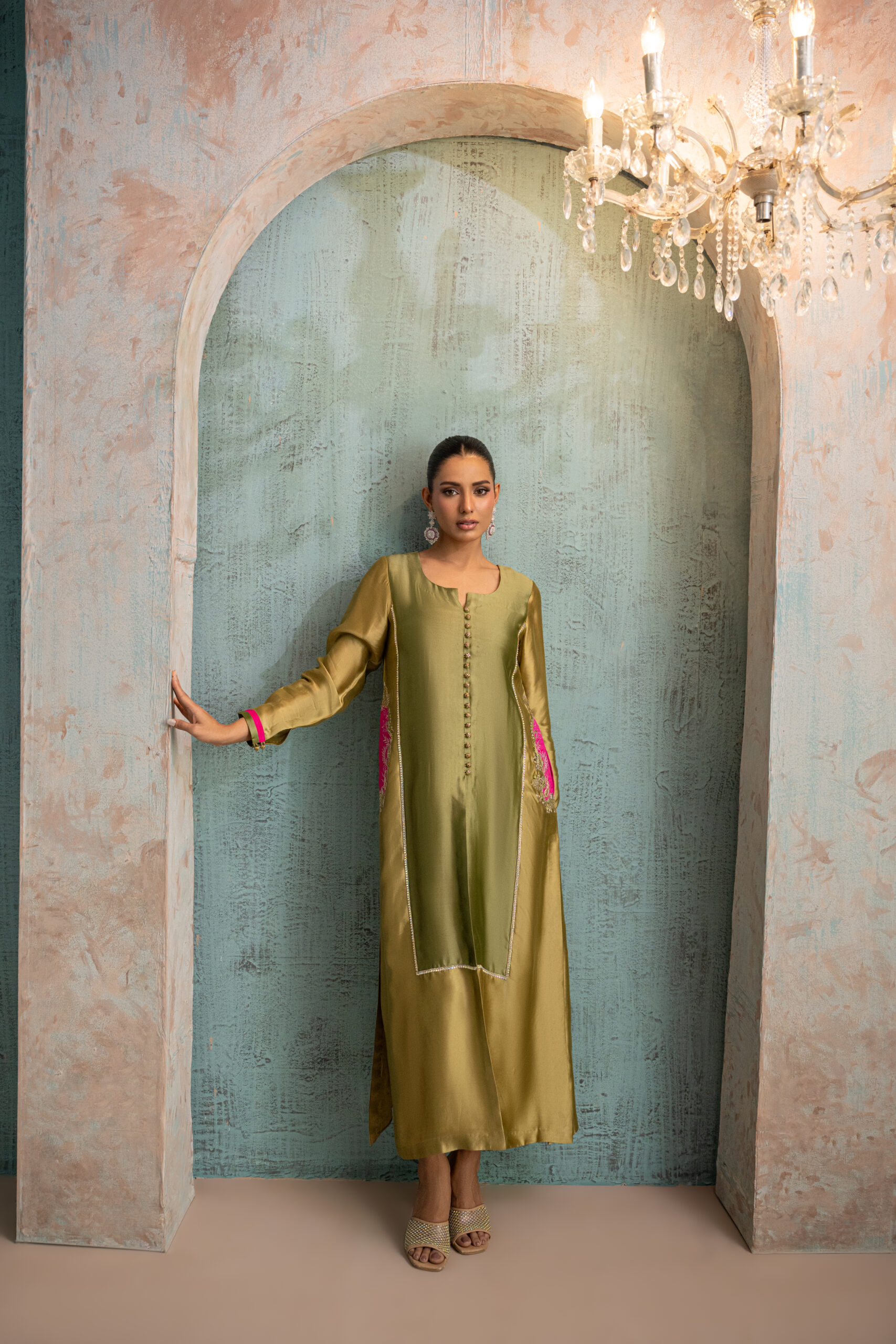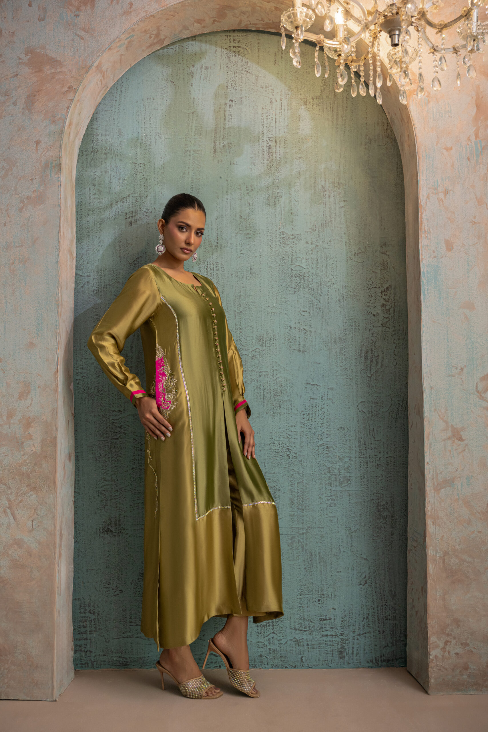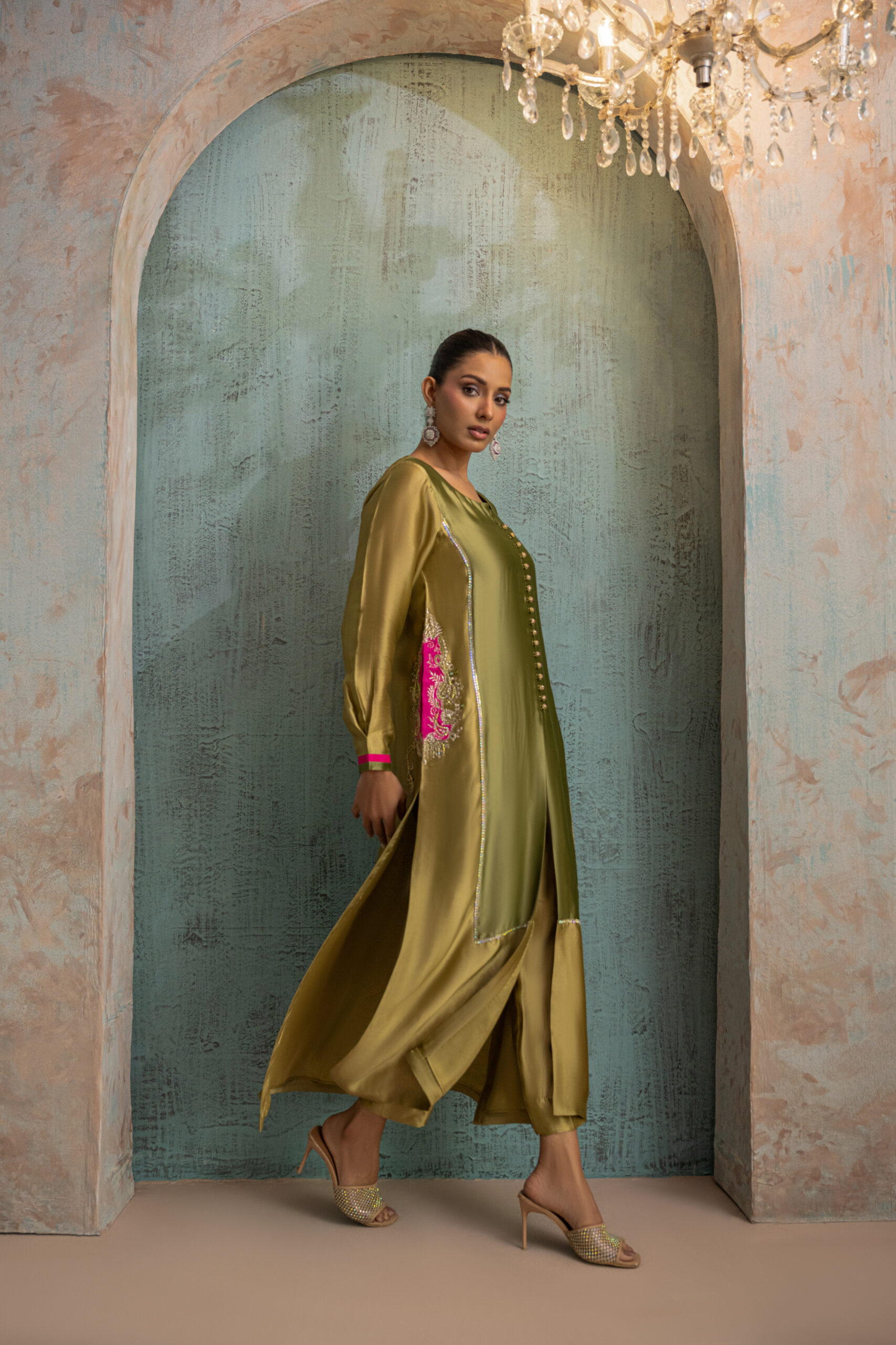 Matcha-toned two-shade green panelled ensemble, beautifully detailed with multicolour stonework, complemented by zari and lurex-embroidered side pockets adorned with intricate stone embellishments, and finished with charming bird-and-cage detailing along the back side slits, paired with sleek straight pants.