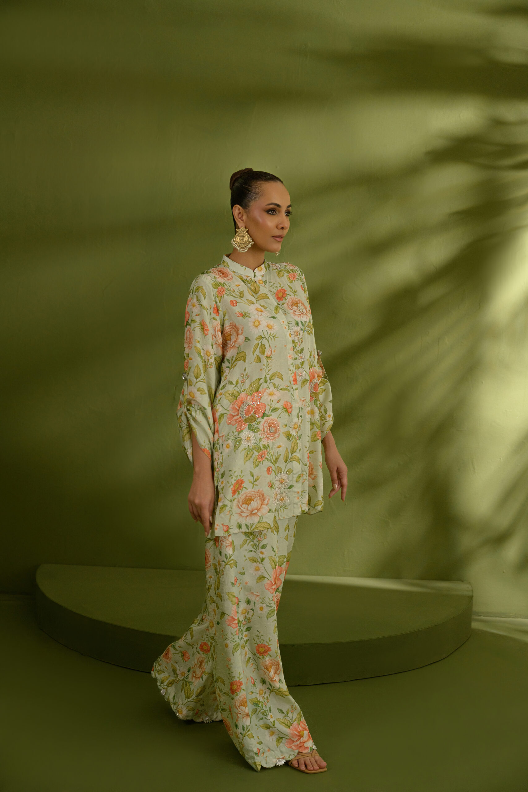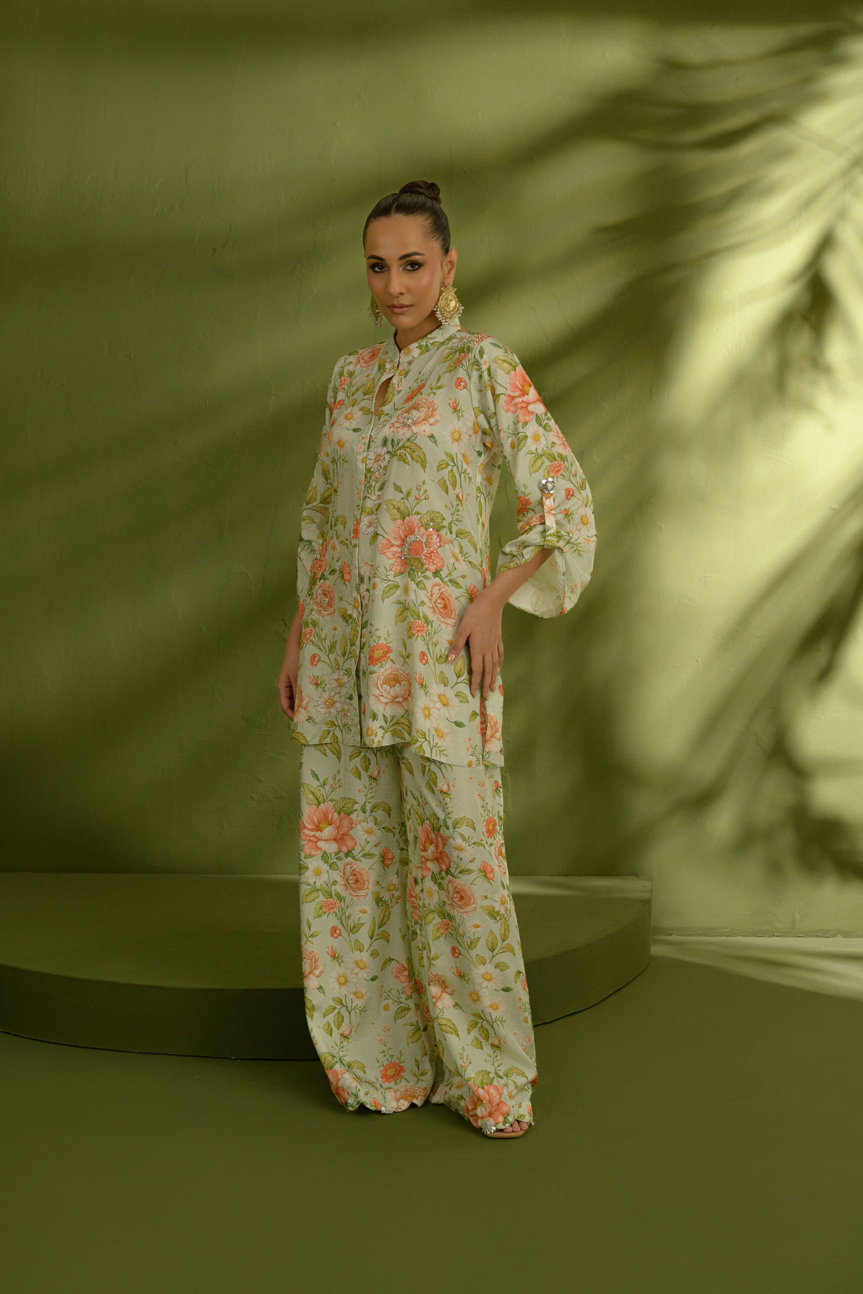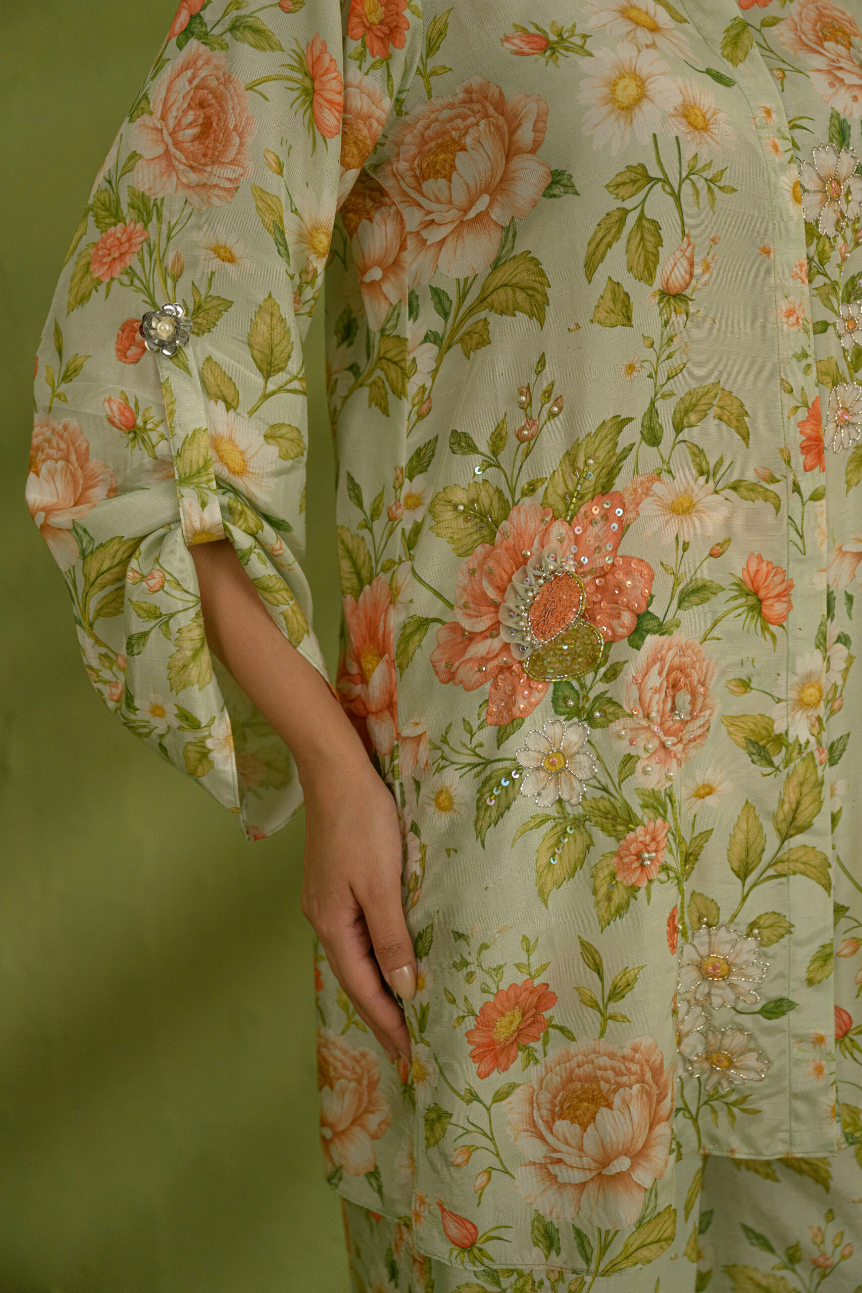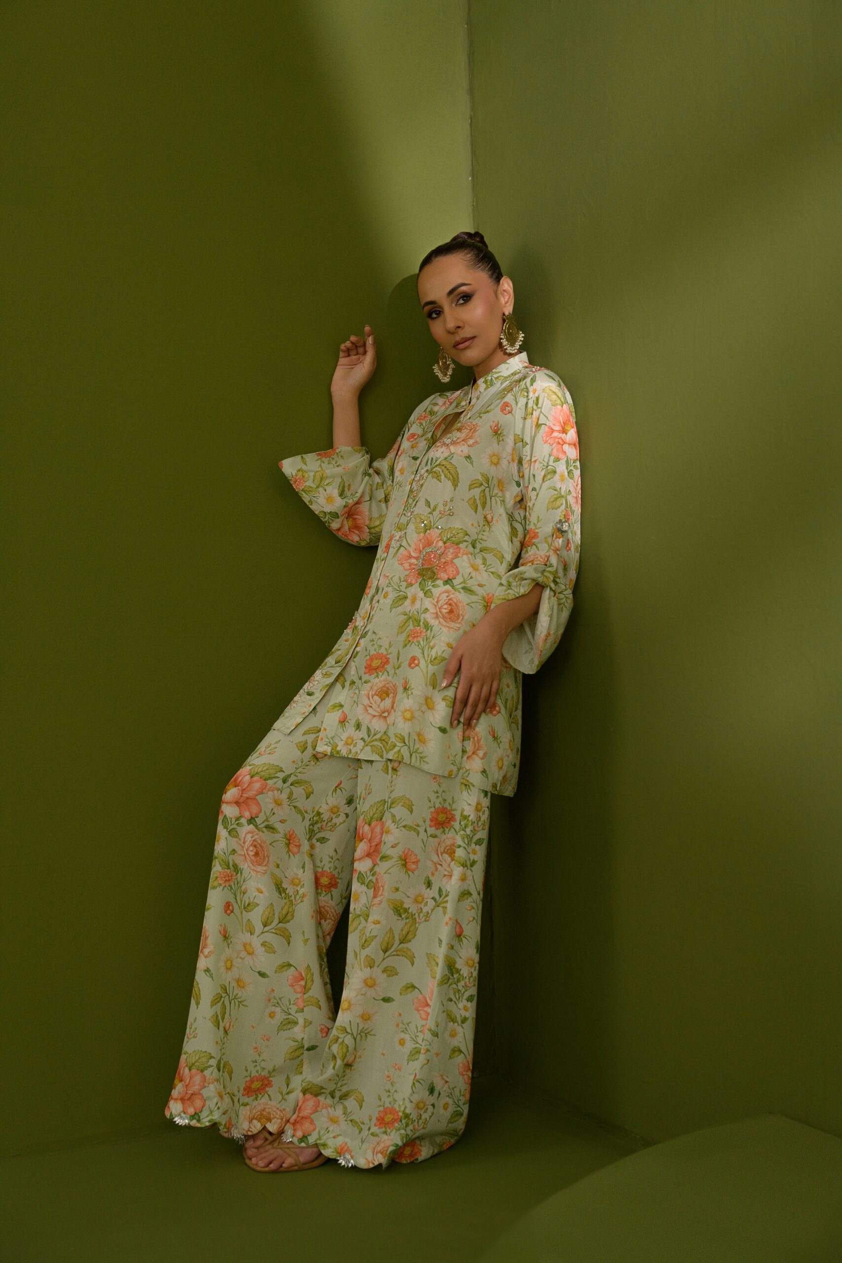 A mint green, summer-fresh pastel co-ord set adorned with delicate sequins and hand-embellished floral detailing on the shirt, paired effortlessly with flared flapper pants.