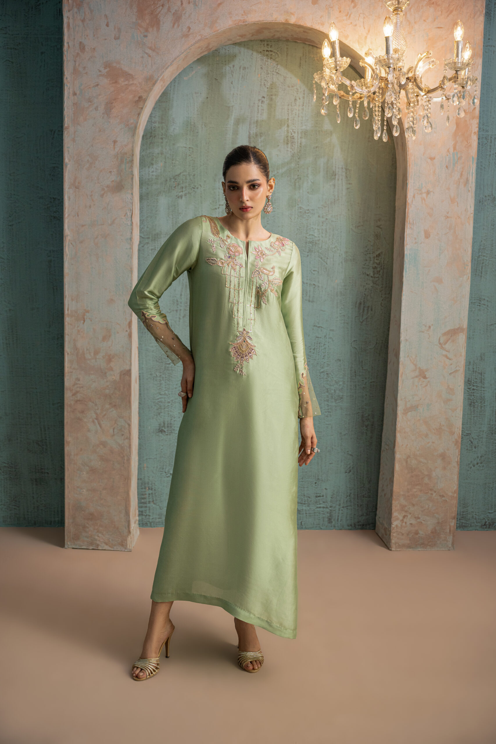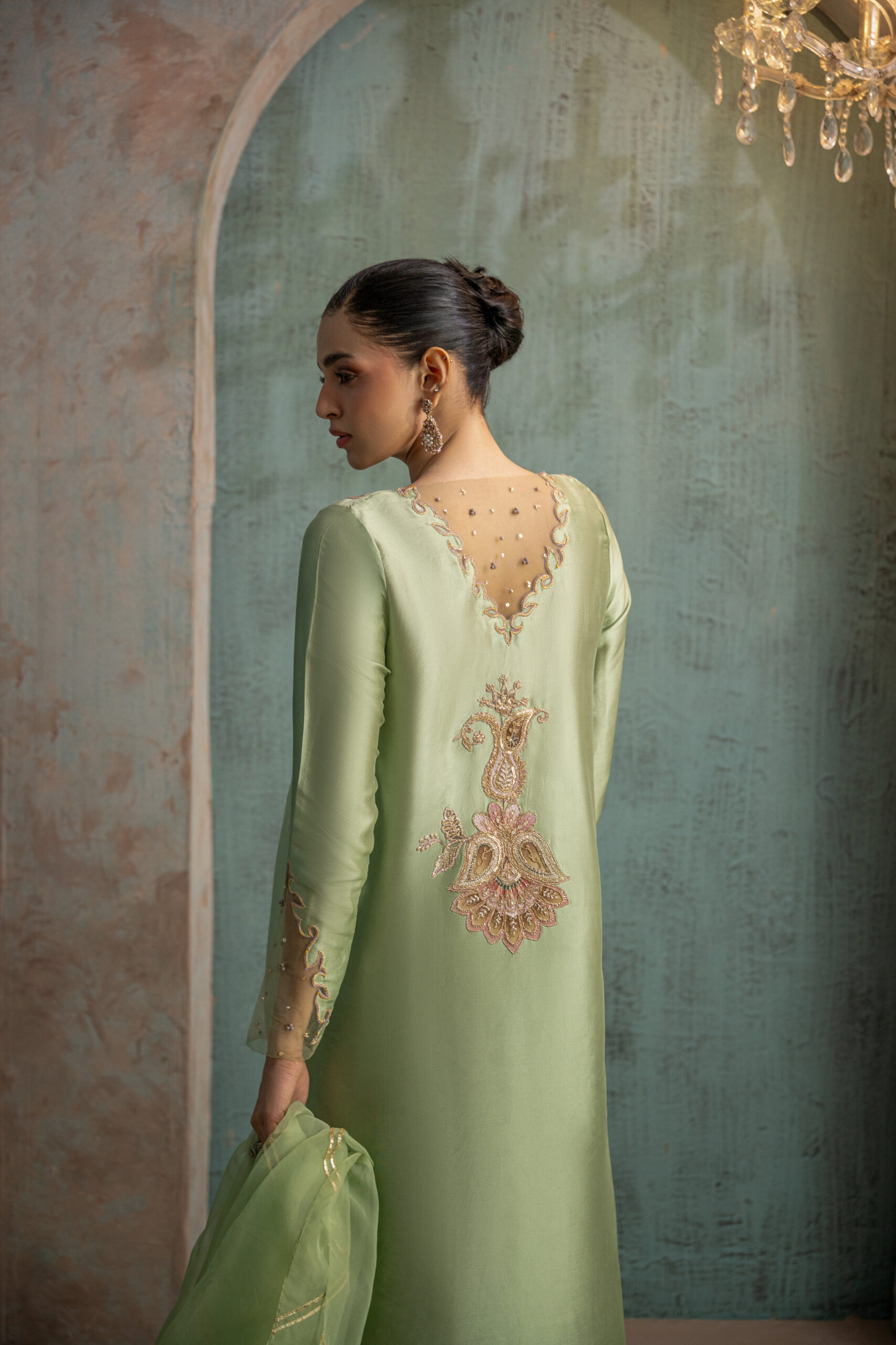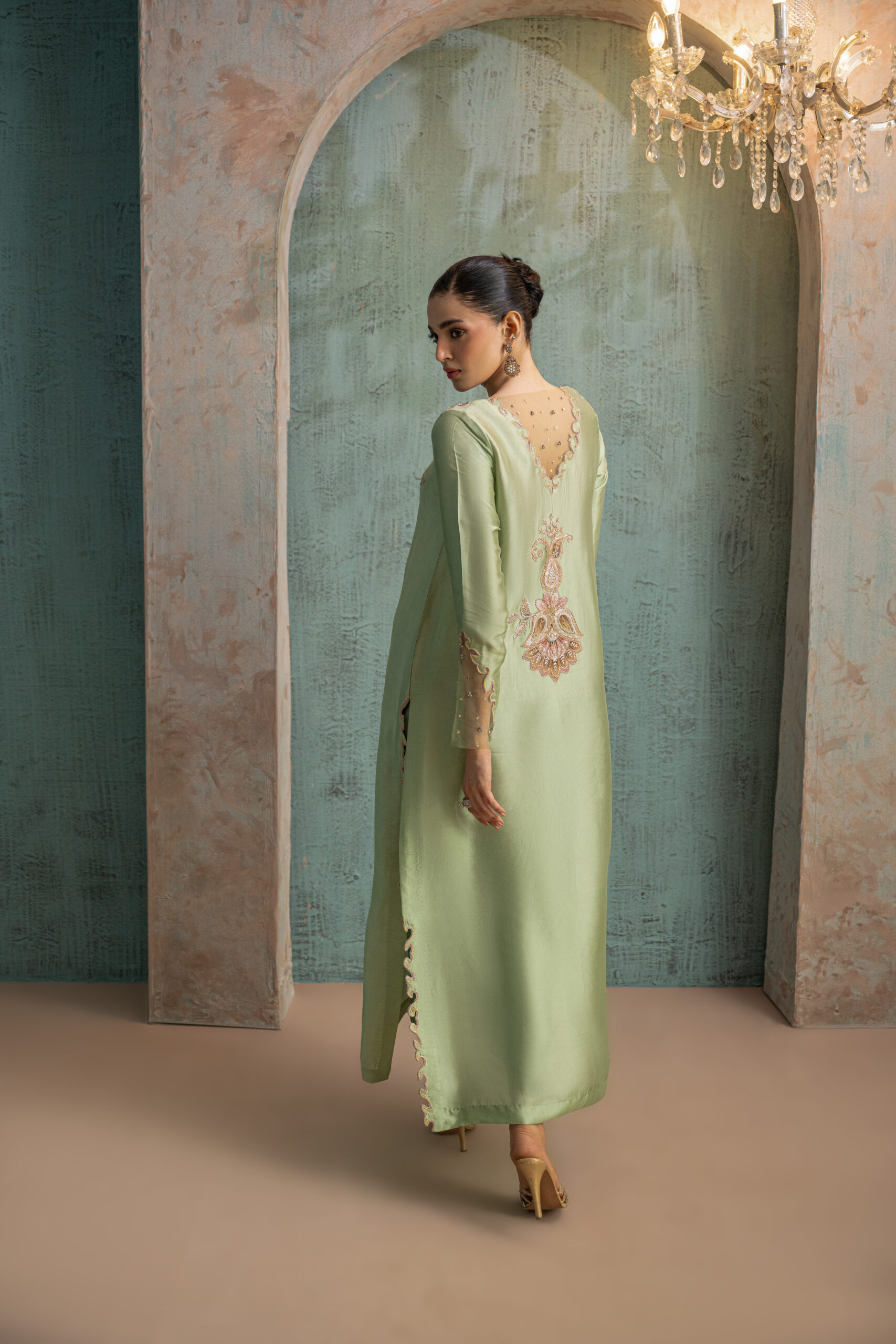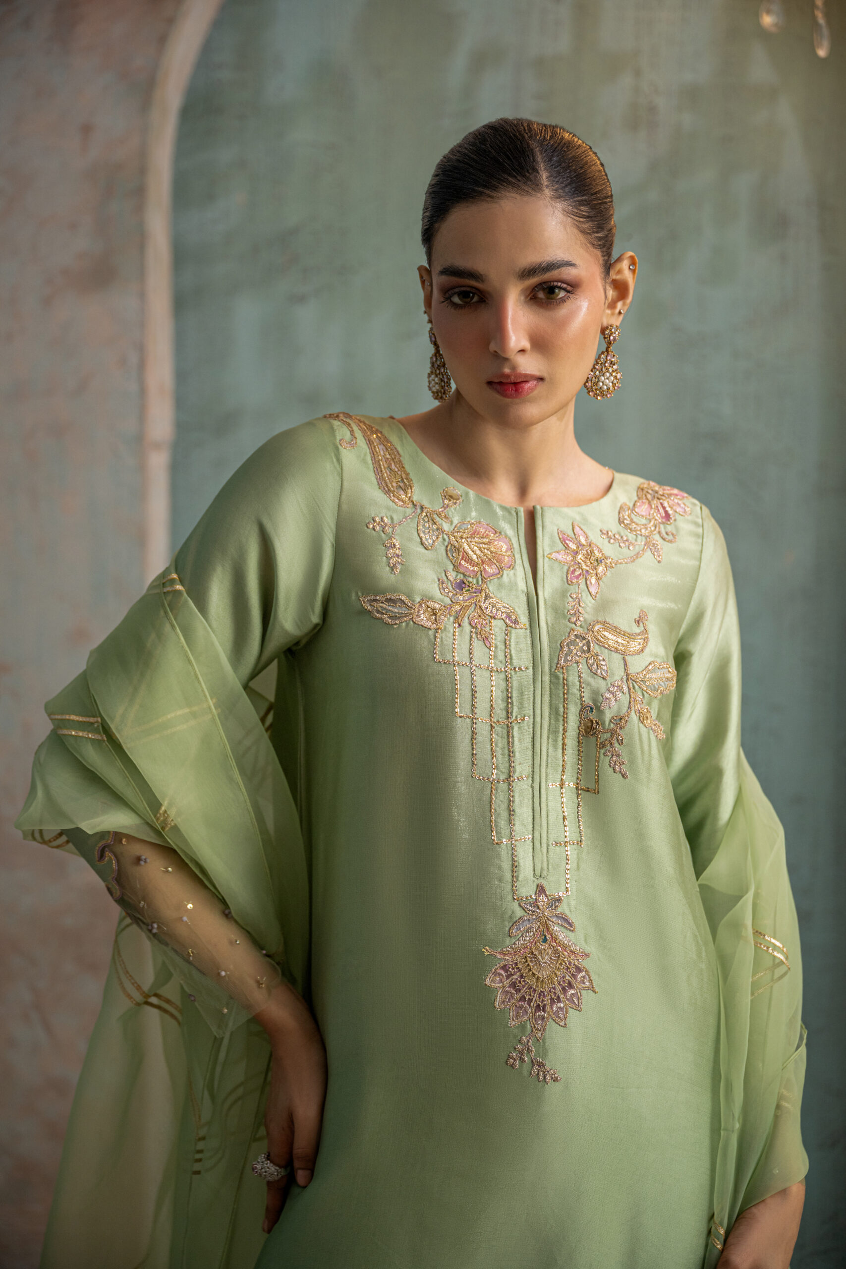 Mint green buttersilk long shirt featuring mauve pink and olive green paisley-floral motifs with intricate gold zari detailing along the neckline. The shirt has wavy cutwork side slits and a V-shaped back neckline adorned with net and floral motif accents. Styled with straight pants and a mint green organza dupatta embellished with diagonal gold gota lines to complete the ensemble.