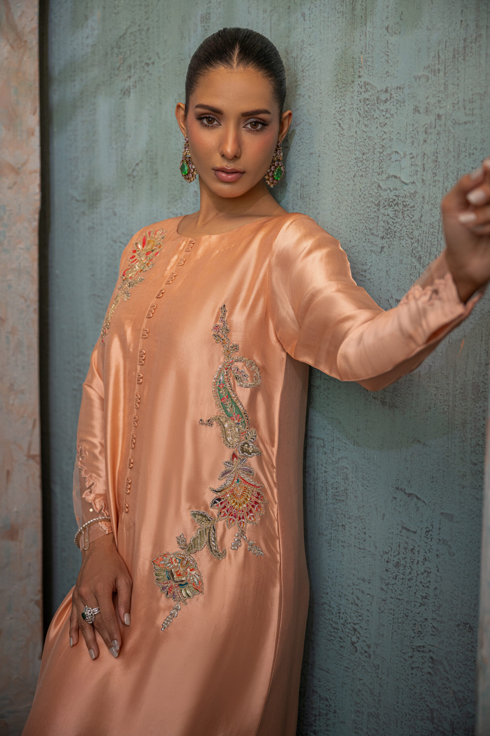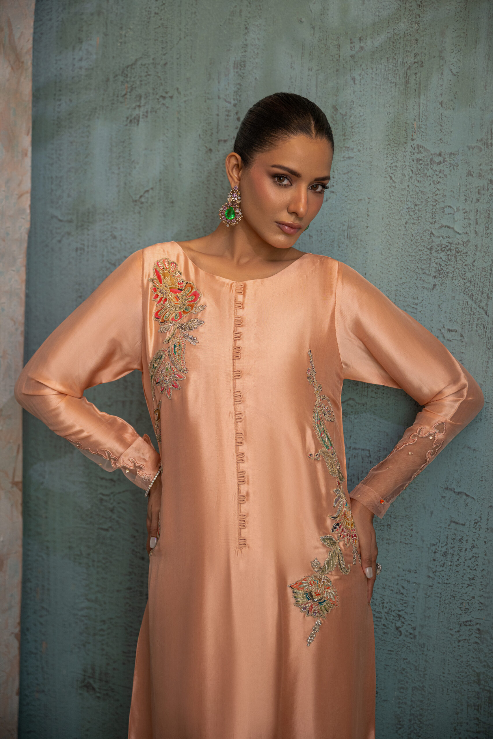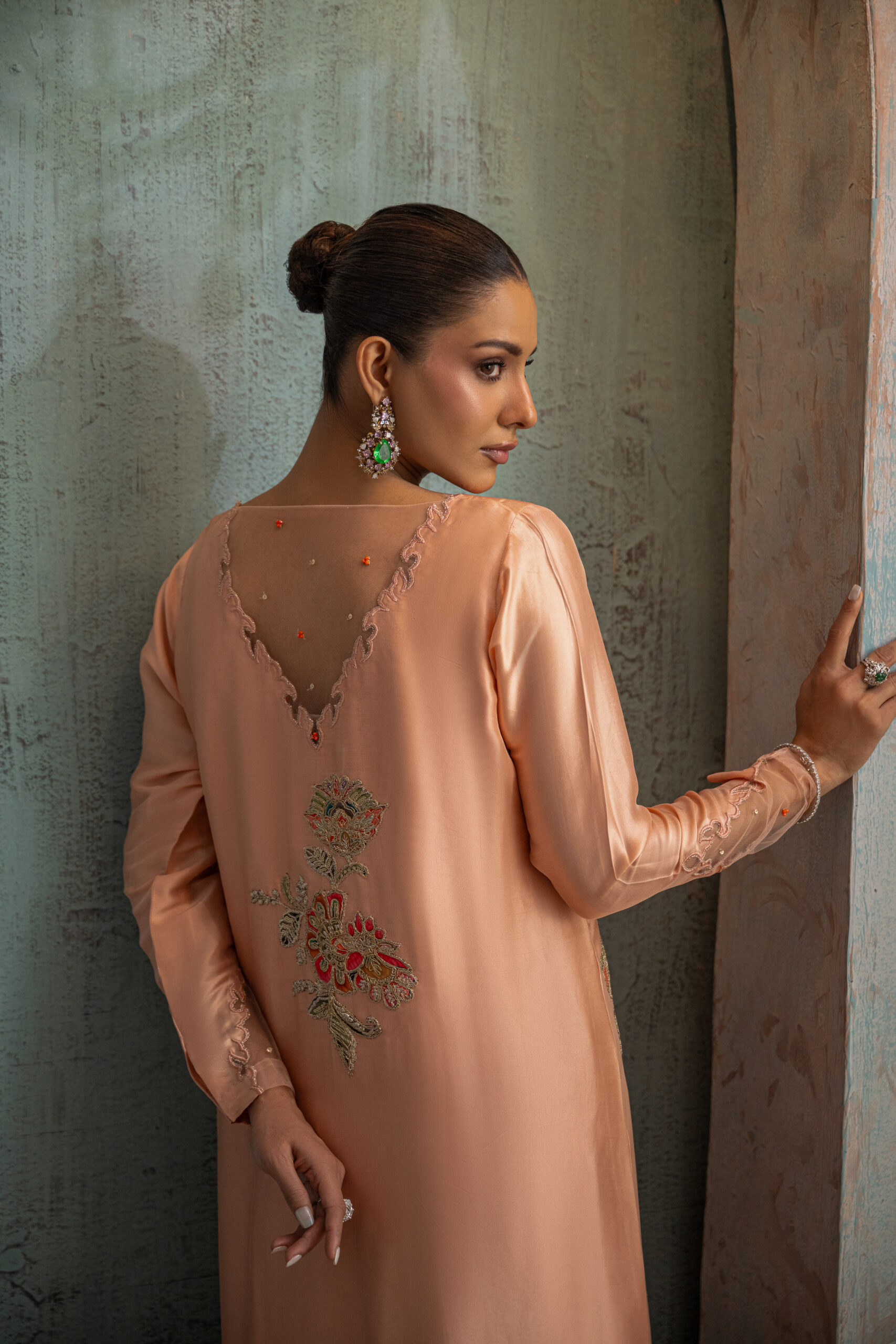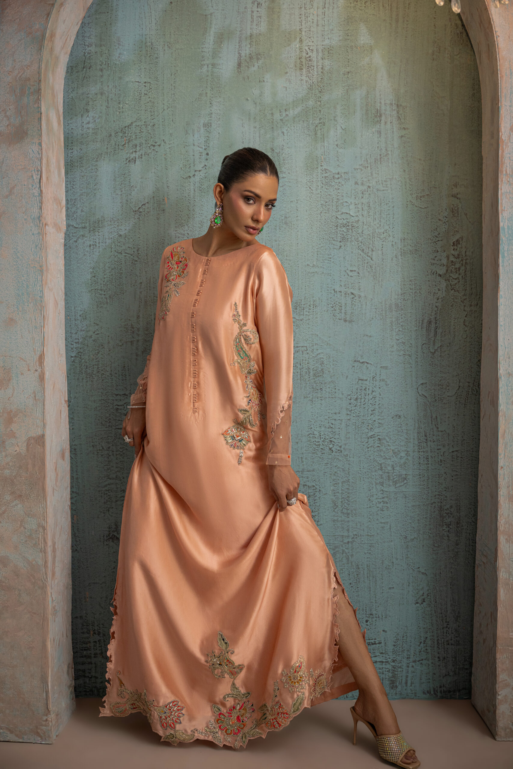 A flowing peach butter silk kaftan with a looped front, highlighted by delicate multi-paisley cutwork on the hemline and side slits. Finished with an intricately detailed back featuring sequins net and a beautiful motif, perfect for a timeless Ramadan look.