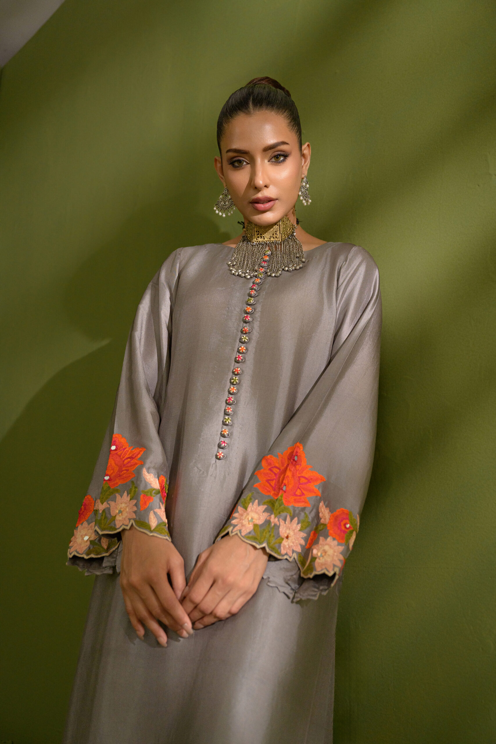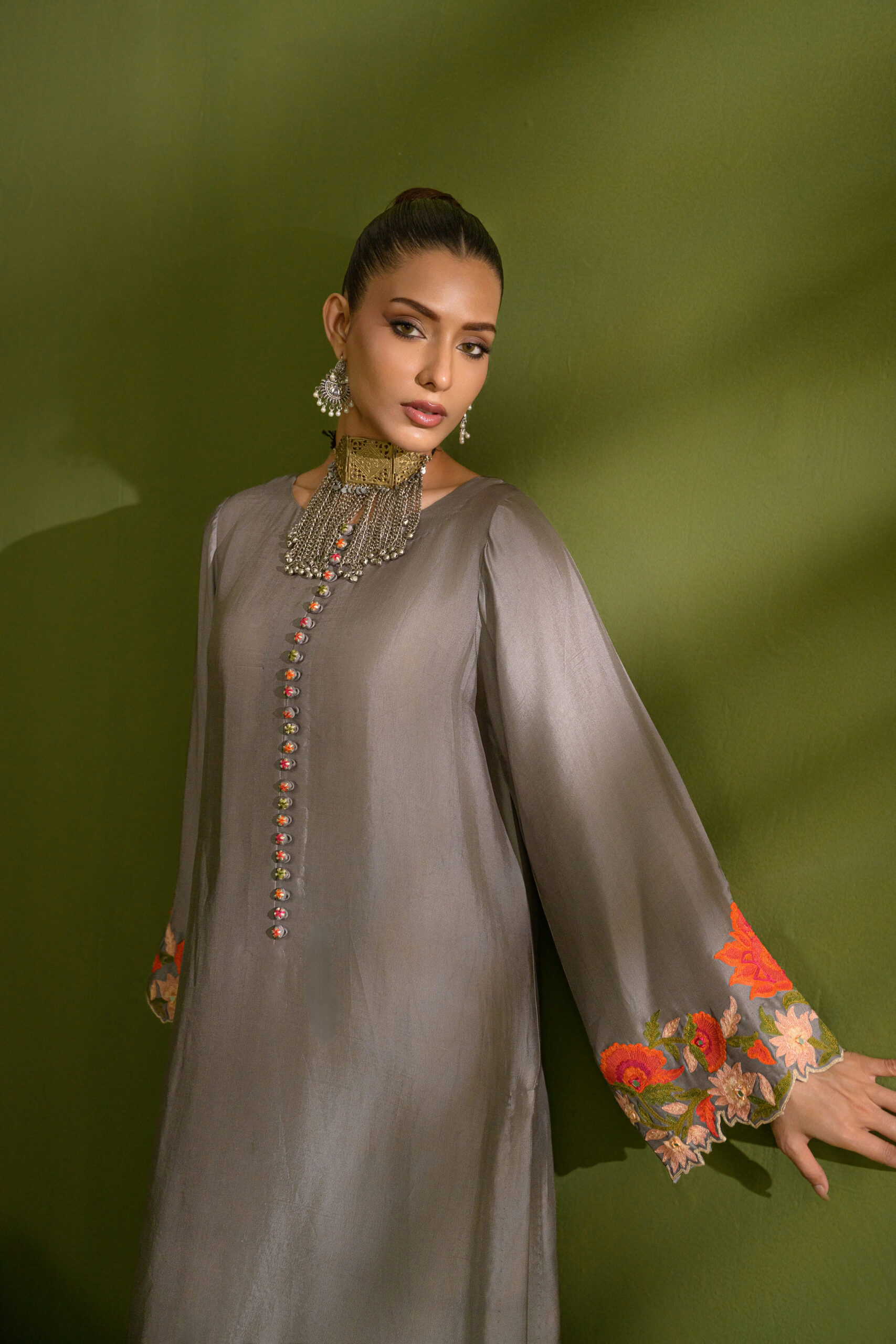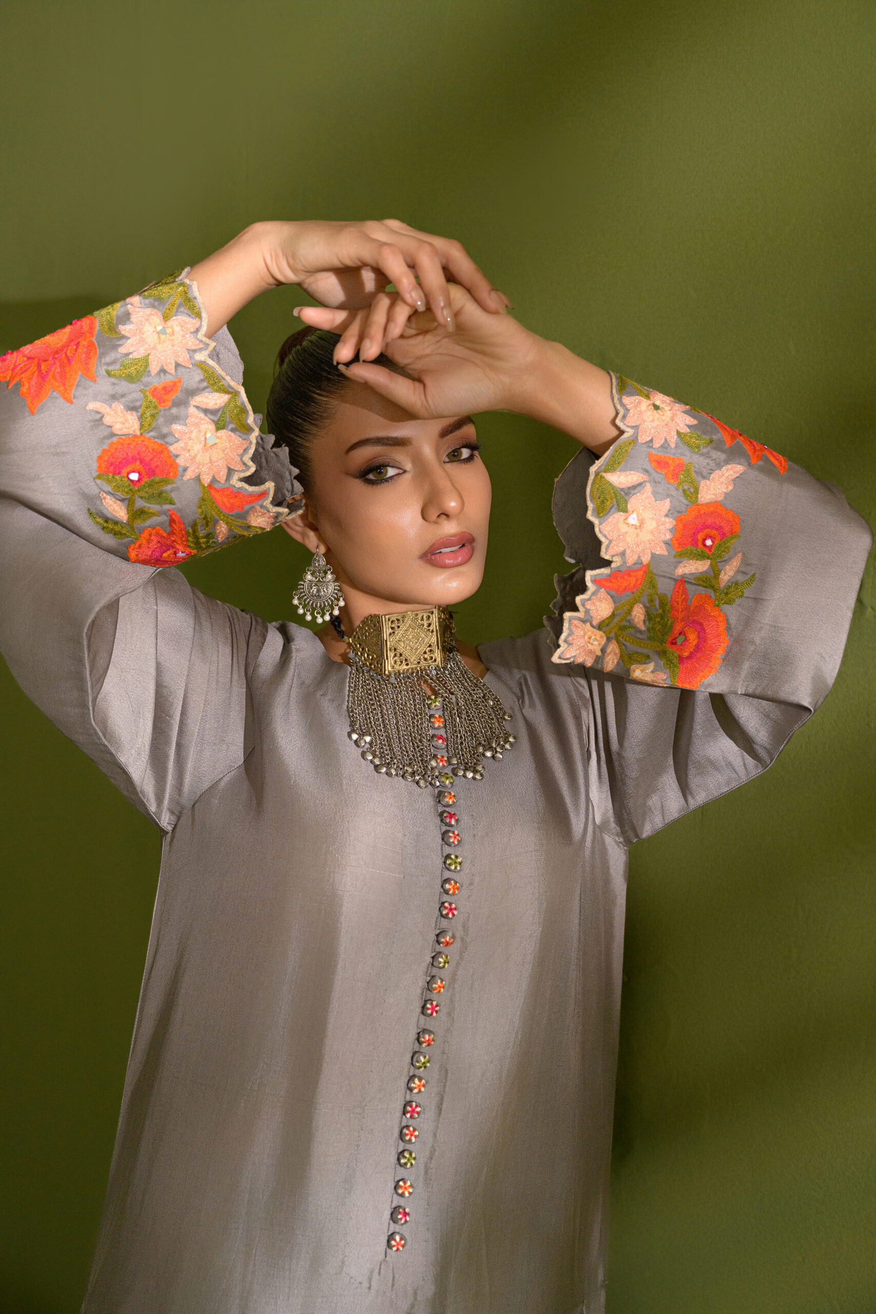 Grey buttersilk A-line long shirt adorned with a striking red and orange aari and mirror-work border on the bell sleeves, finished with delicate detailing at the back. Paired effortlessly with straight pants for a refined look.