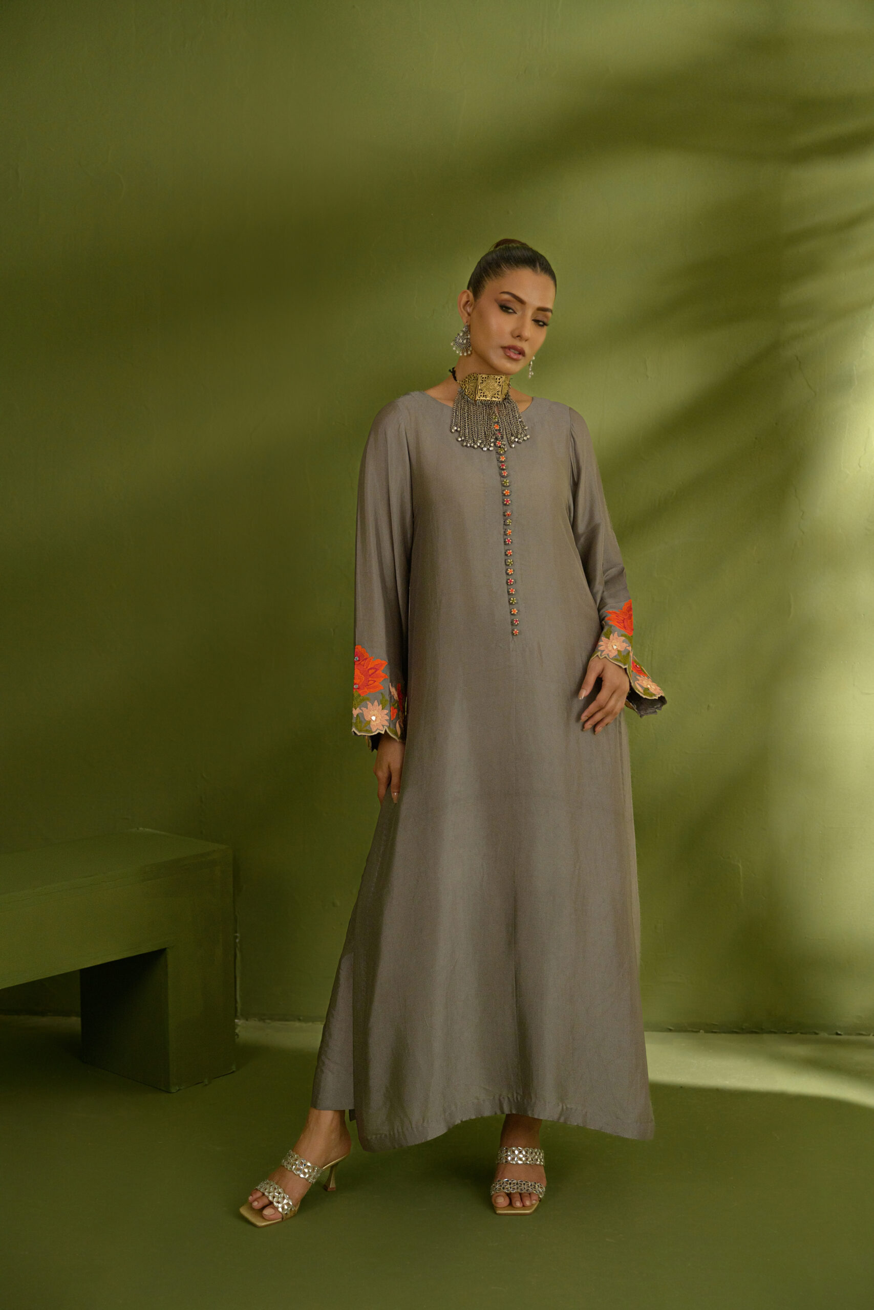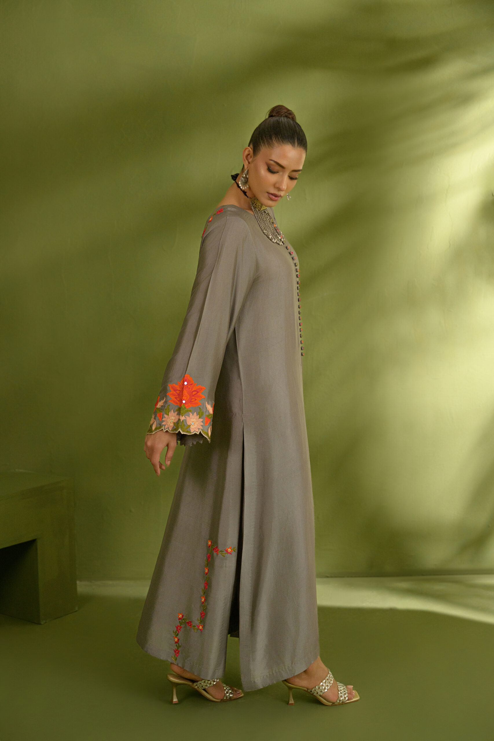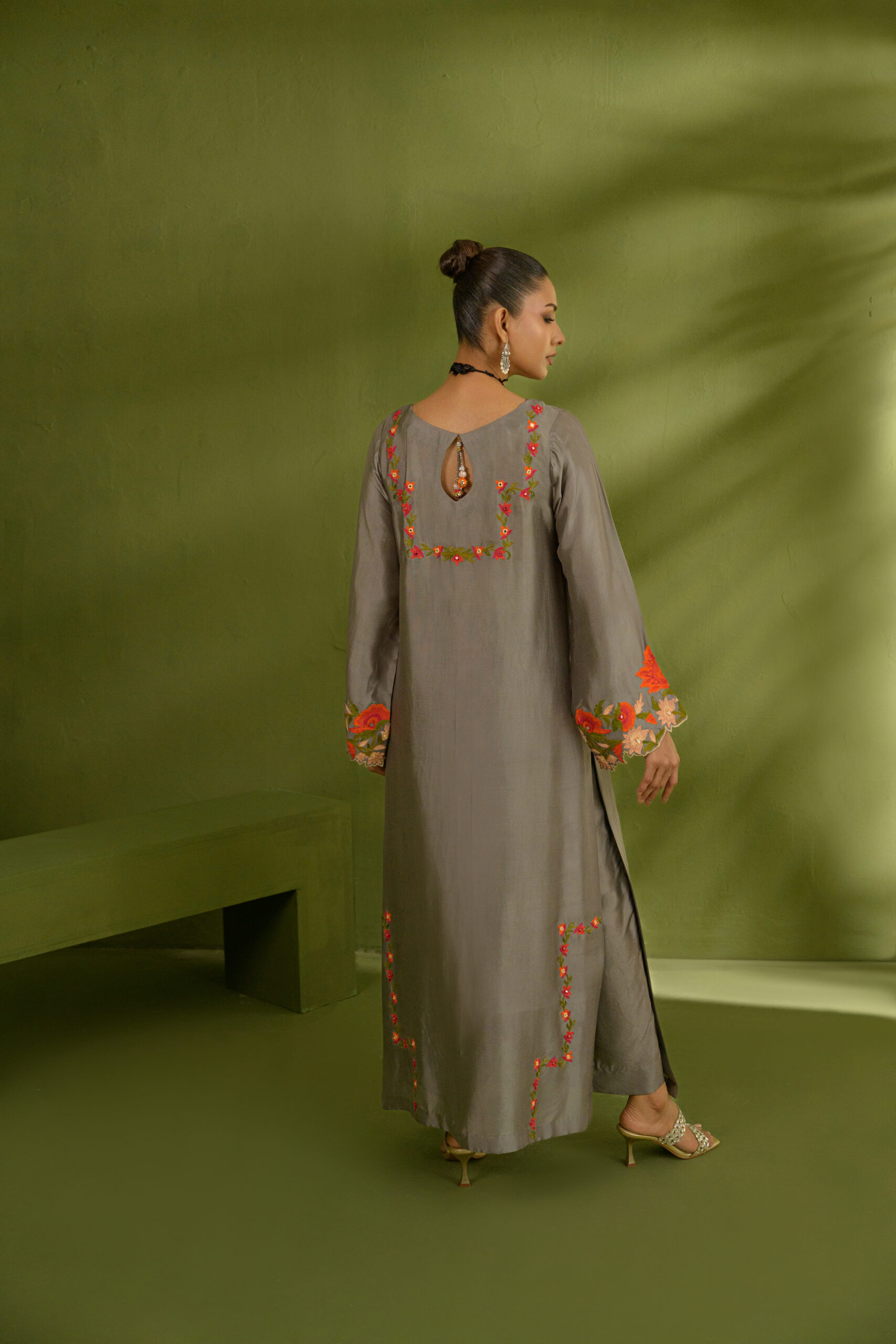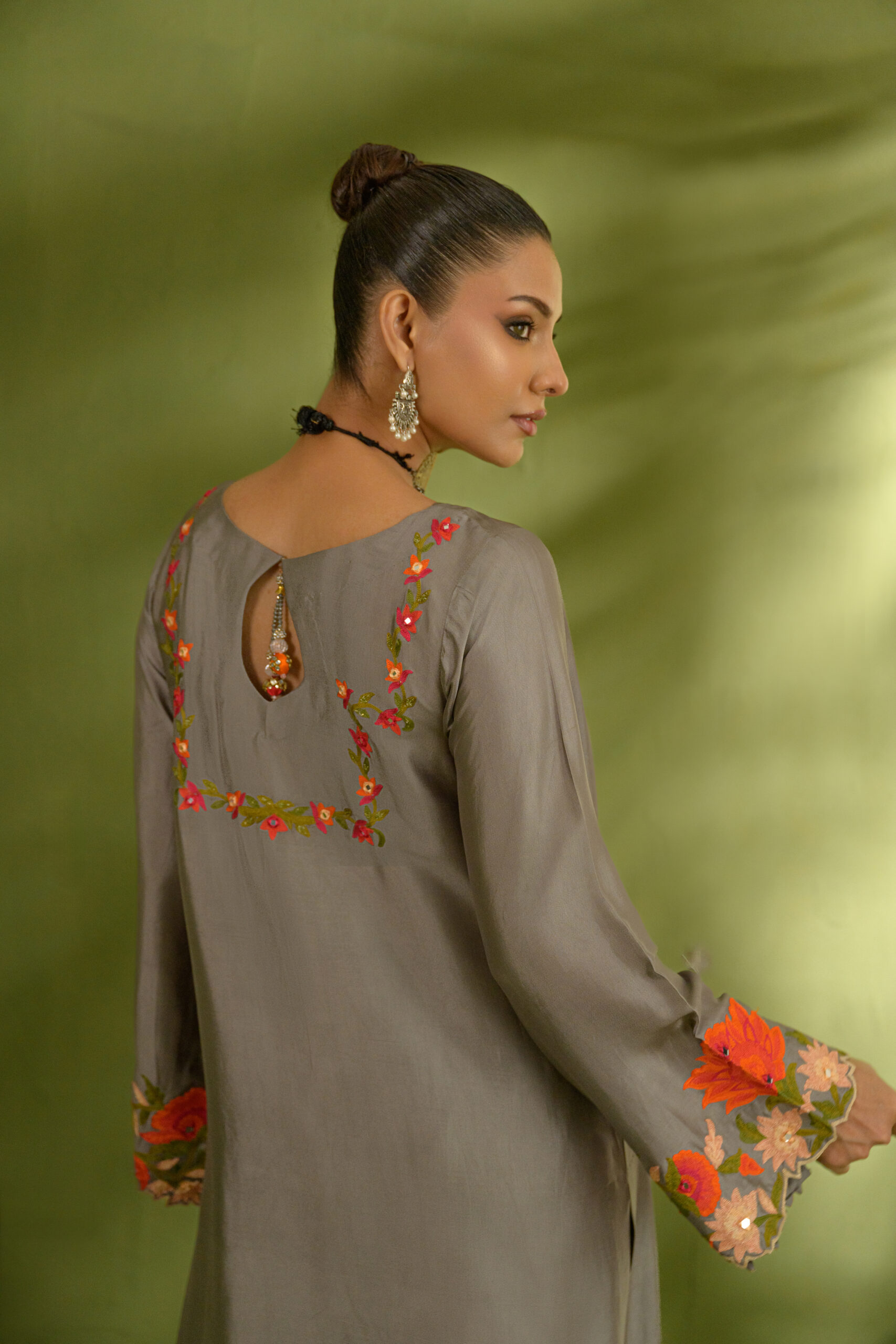 Grey buttersilk A-line long shirt adorned with a striking red and orange aari and mirror-work border on the bell sleeves, finished with delicate detailing at the back. Paired effortlessly with straight pants for a refined look.
