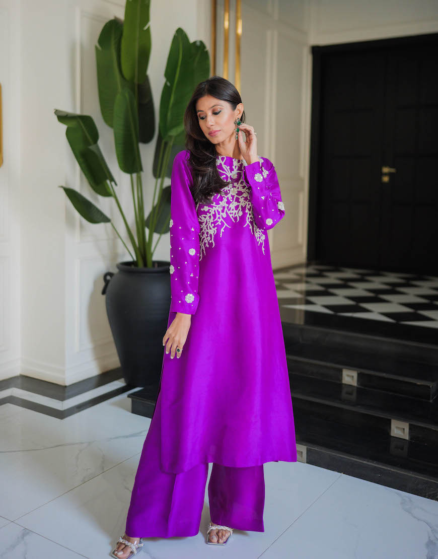 Stunning Purple pure 80gms rawsilk with intricate silver resham and bead work on the neckline and sleeves paired with wide legged pants.