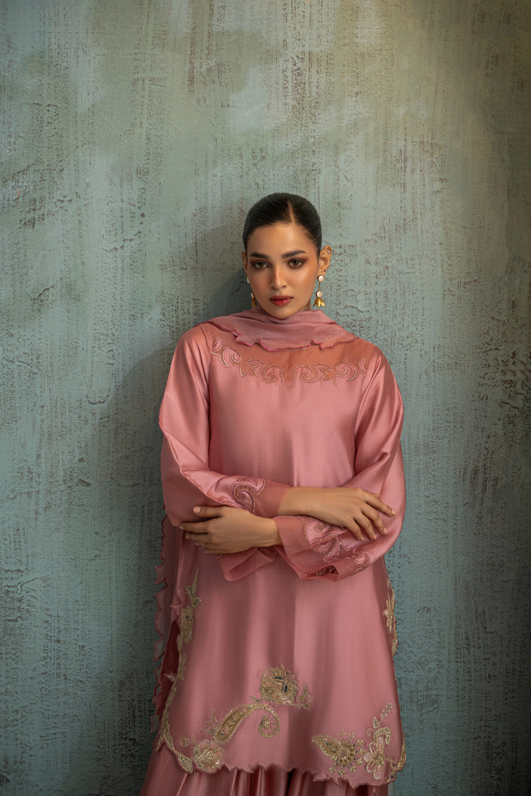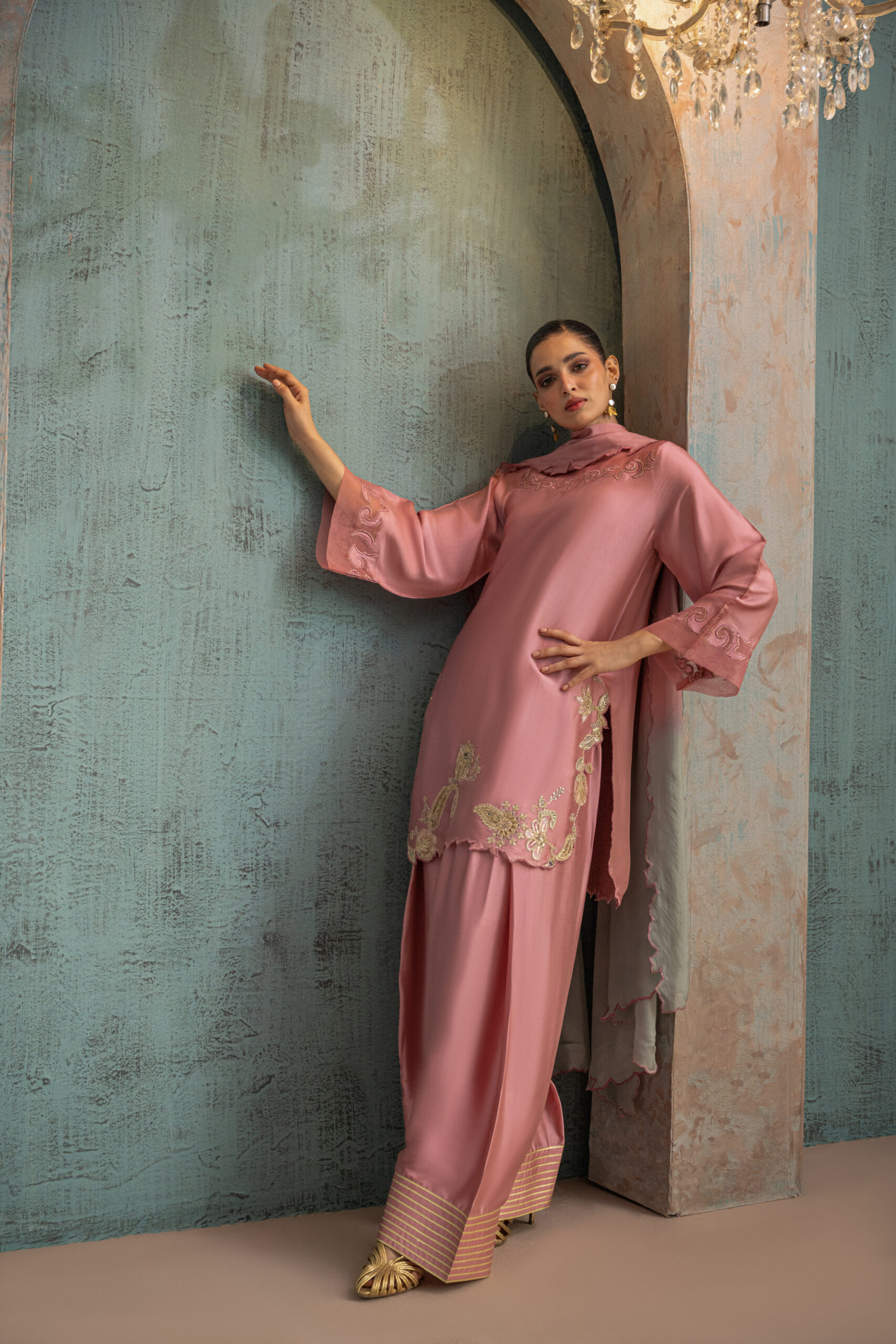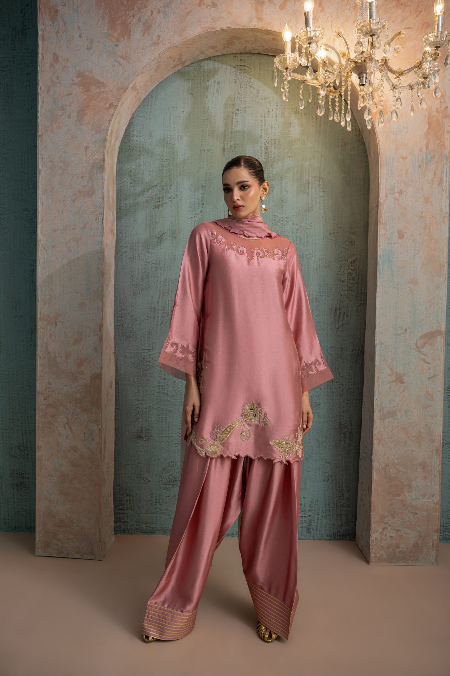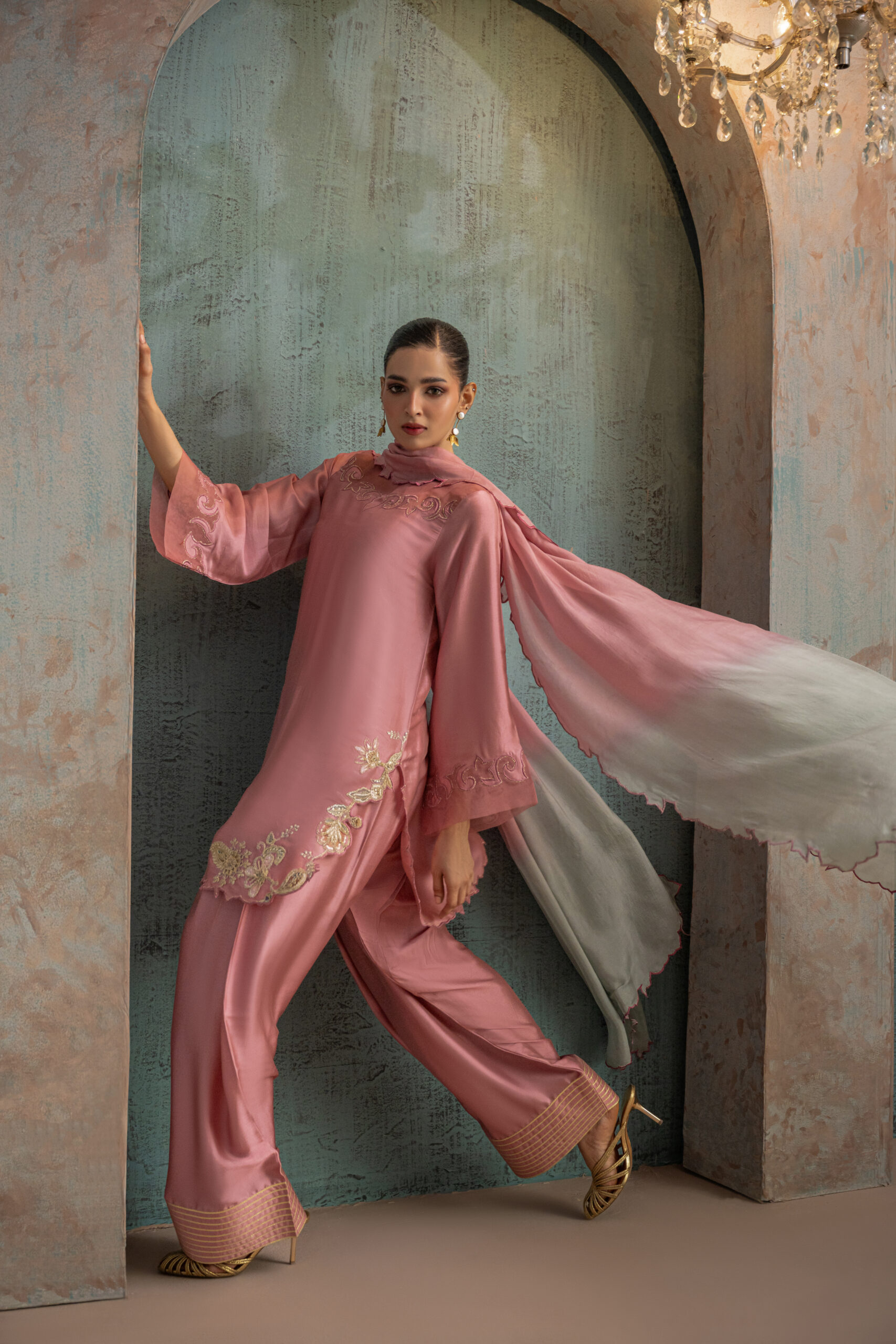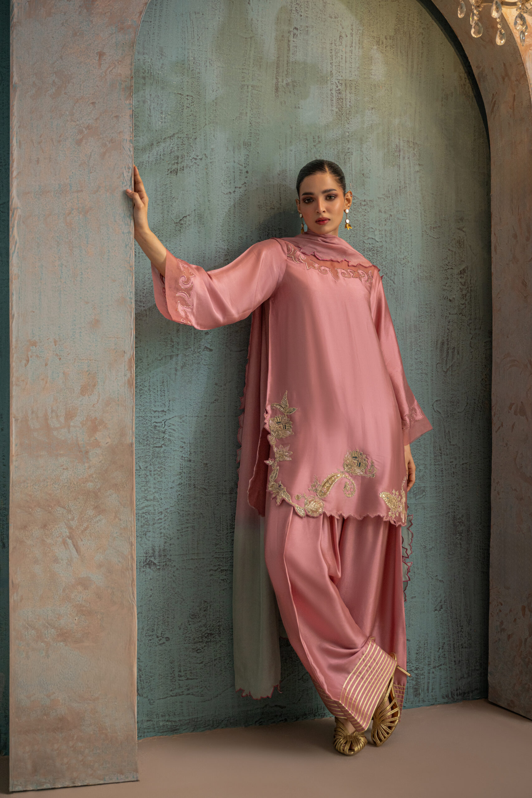 Onion pink buttersilk shirt featuring an organza cutwork scalloped neckline, paired with a beautifully detailed round hemline adorned with floral paisley motifs and gold zari embroidery. Styled with a farshi shalwar featuring gota-lined paincha and completed with a two-shade silk dupatta with cutwork detailing.