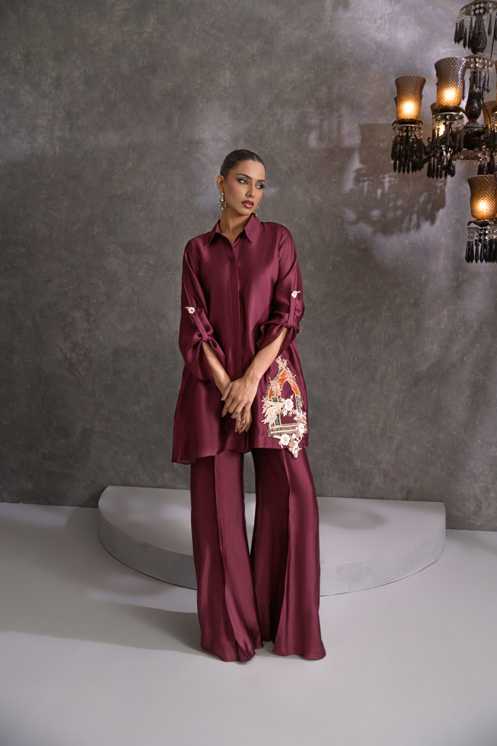 Rendered in a rich maroon wine shade, this sheesha silk front-open coord set is adorned with delicate Mughal and floral detailing along the front and back hemline, paired with flapper pants for a refined finish.